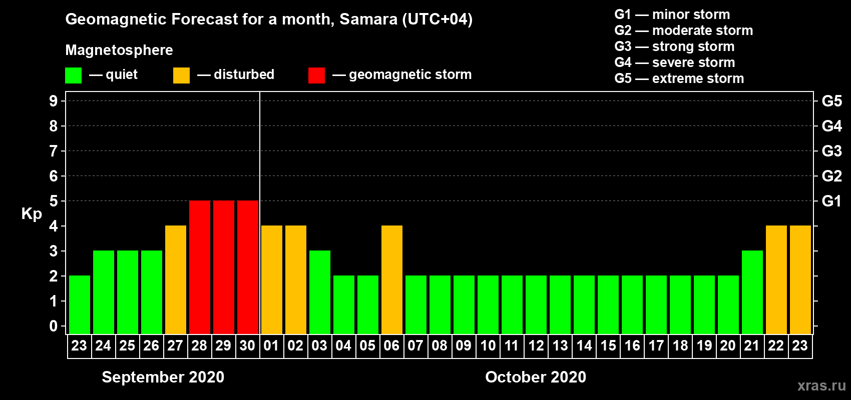 Geomagnetic storm forecast in Samara for Sep 23, 2020
