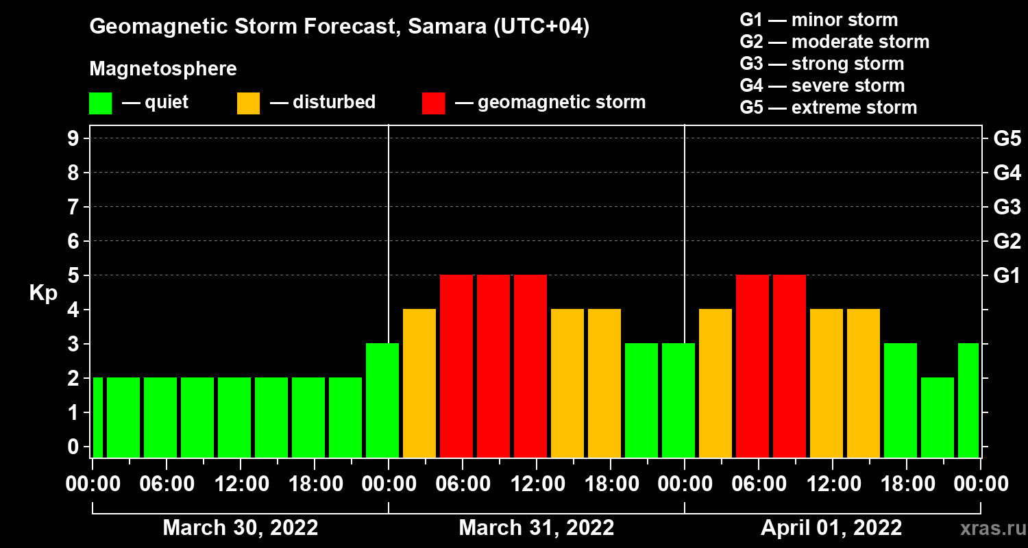 Geomagnetic storm forecast in Samara for Mar 30, 2022