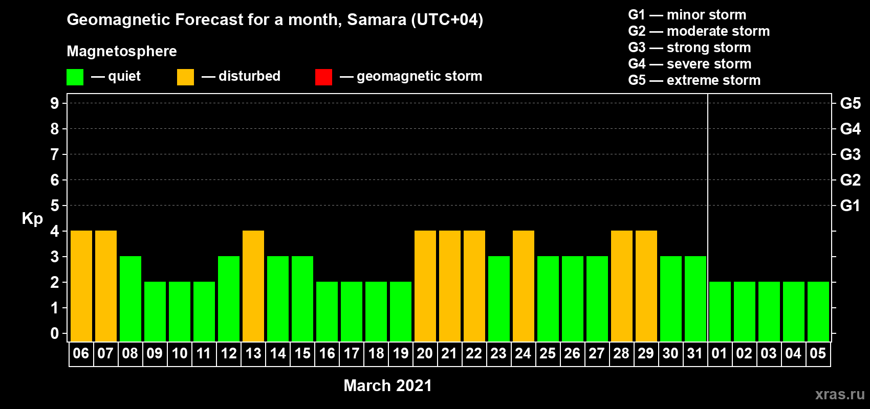 Geomagnetic storm forecast in Samara for Mar 06, 2021