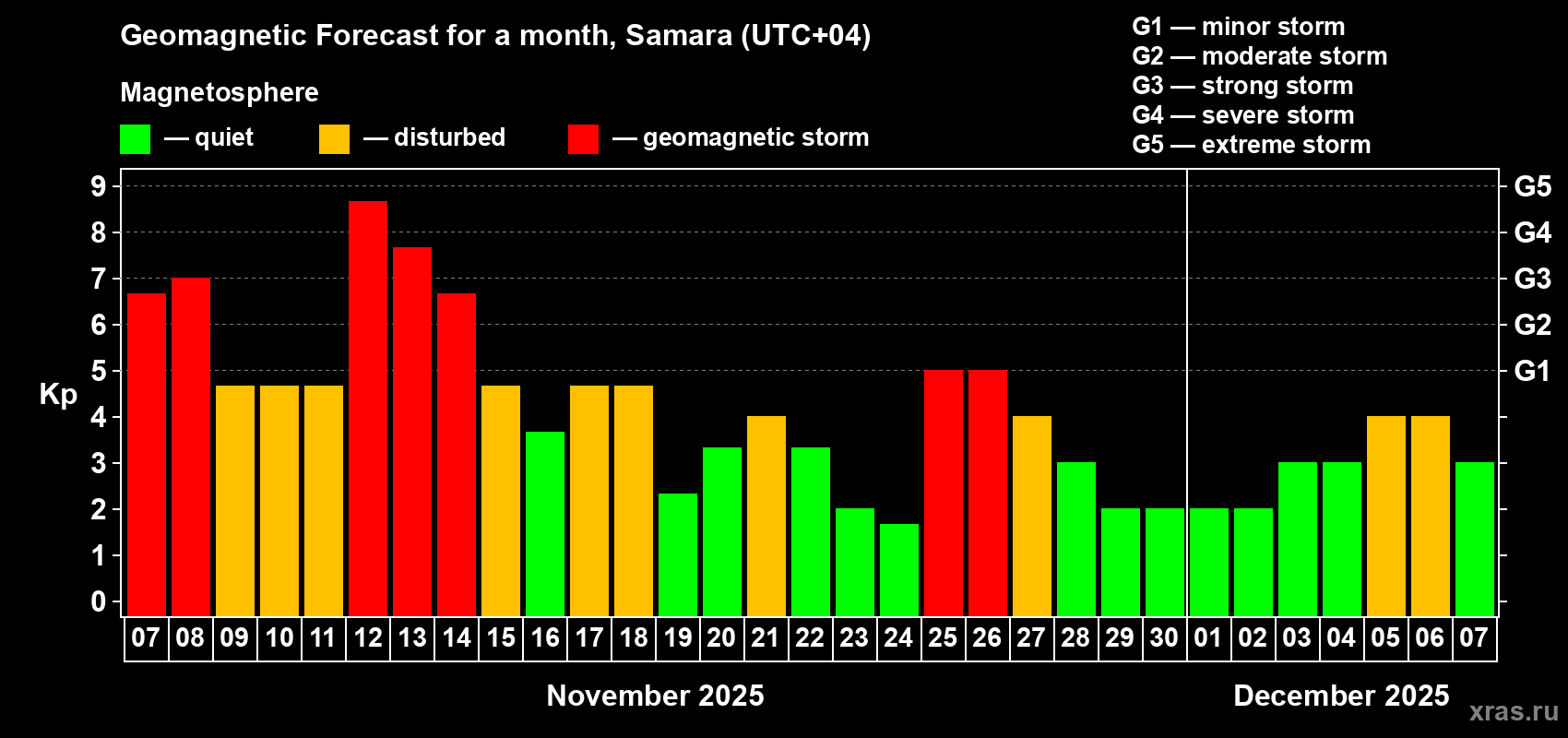 Geomagnetic storm forecast in Samara for Nov 07, 2025