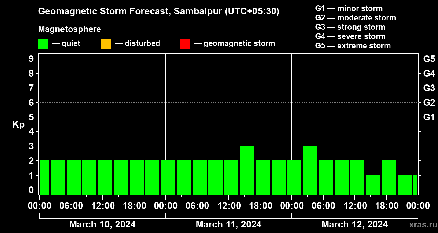 Geomagnetic storm forecast in Sambalpur for Mar 10, 2024