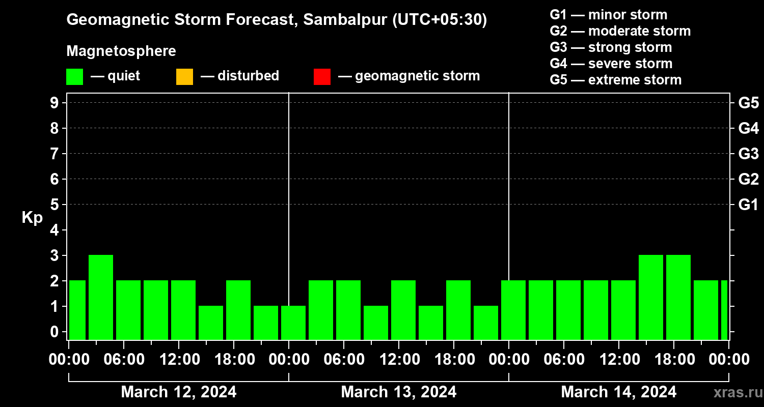 Geomagnetic storm forecast in Sambalpur for Mar 12, 2024