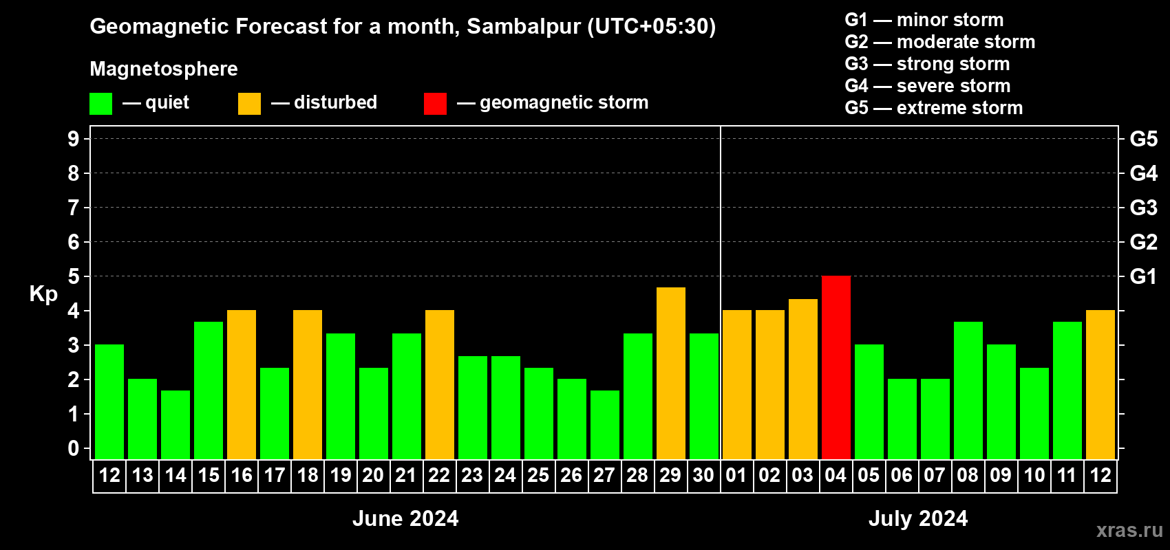 Geomagnetic storm forecast in Sambalpur for Jun 12, 2024
