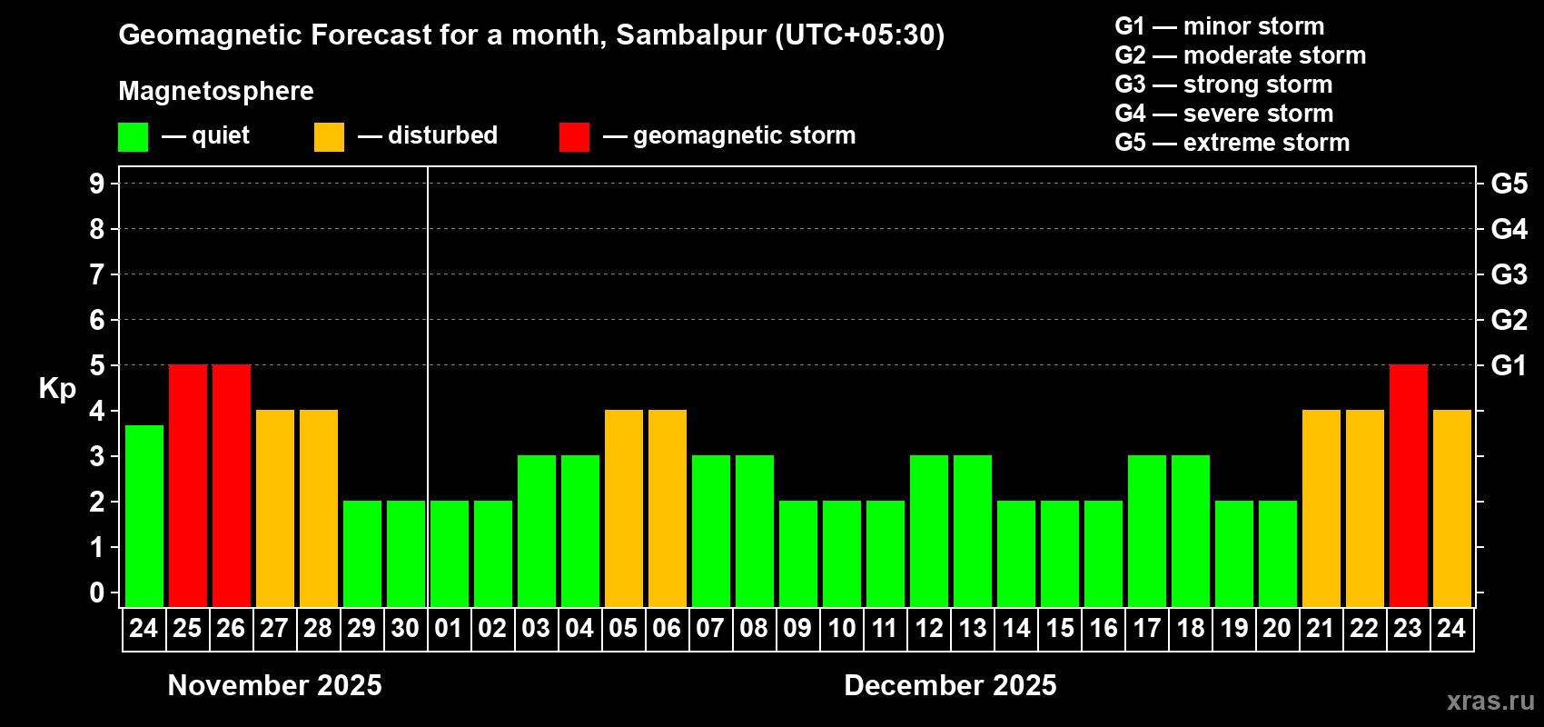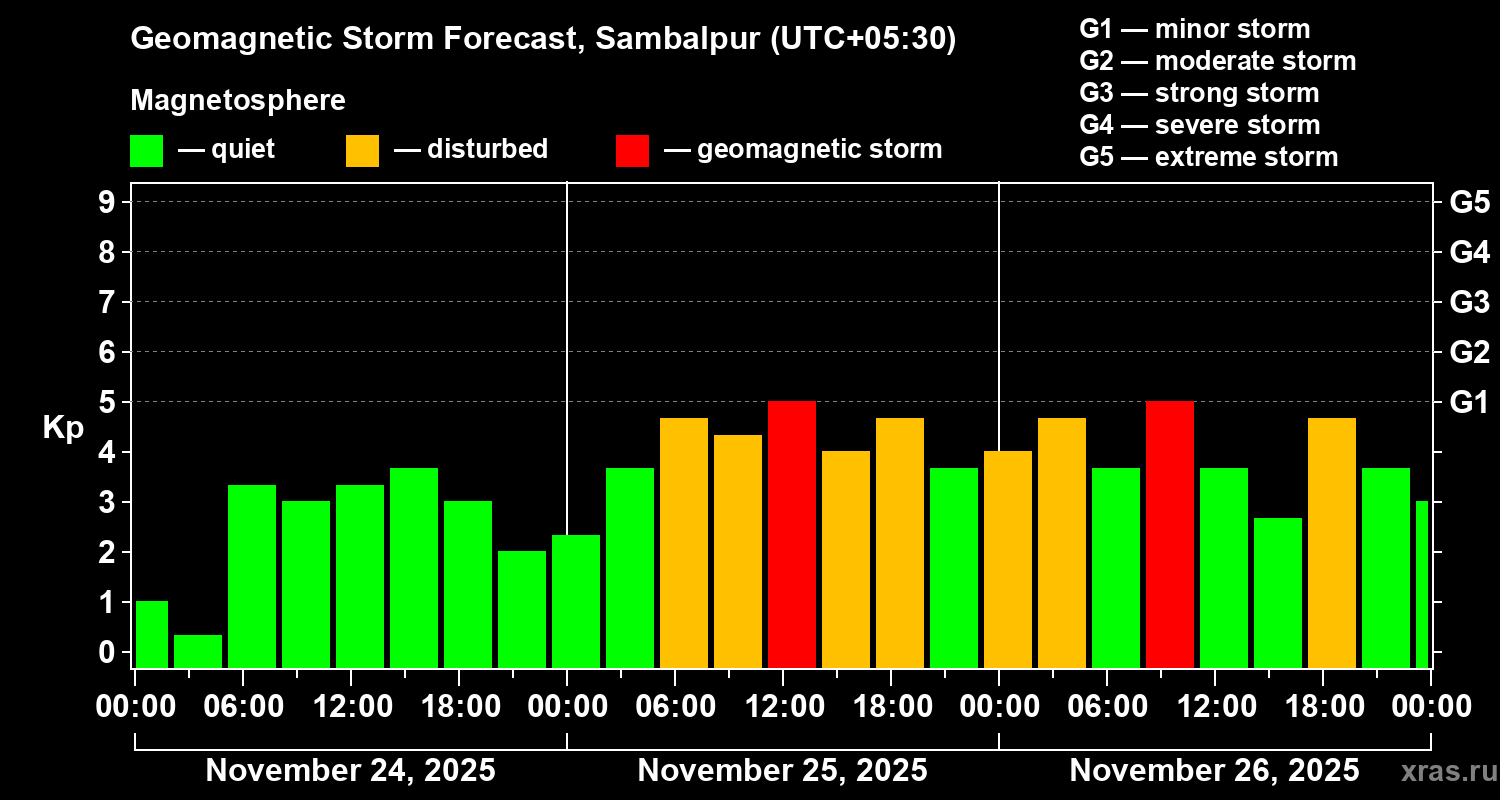 Geomagnetic storm forecast in Sambalpur for Nov 24, 2025