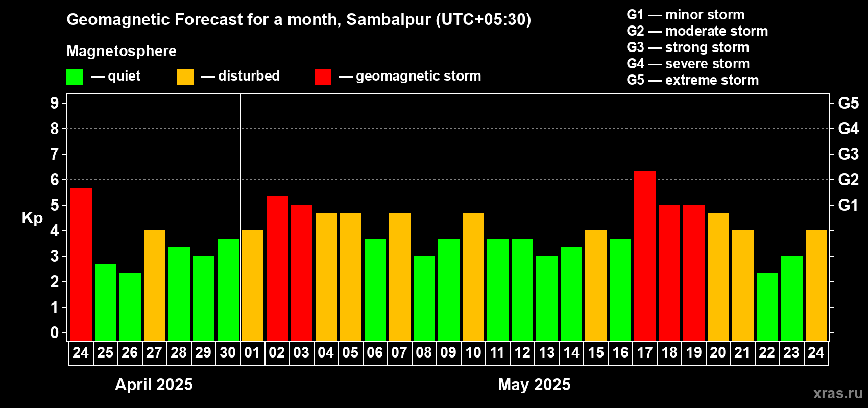 Geomagnetic storm forecast in Sambalpur for Apr 24, 2025