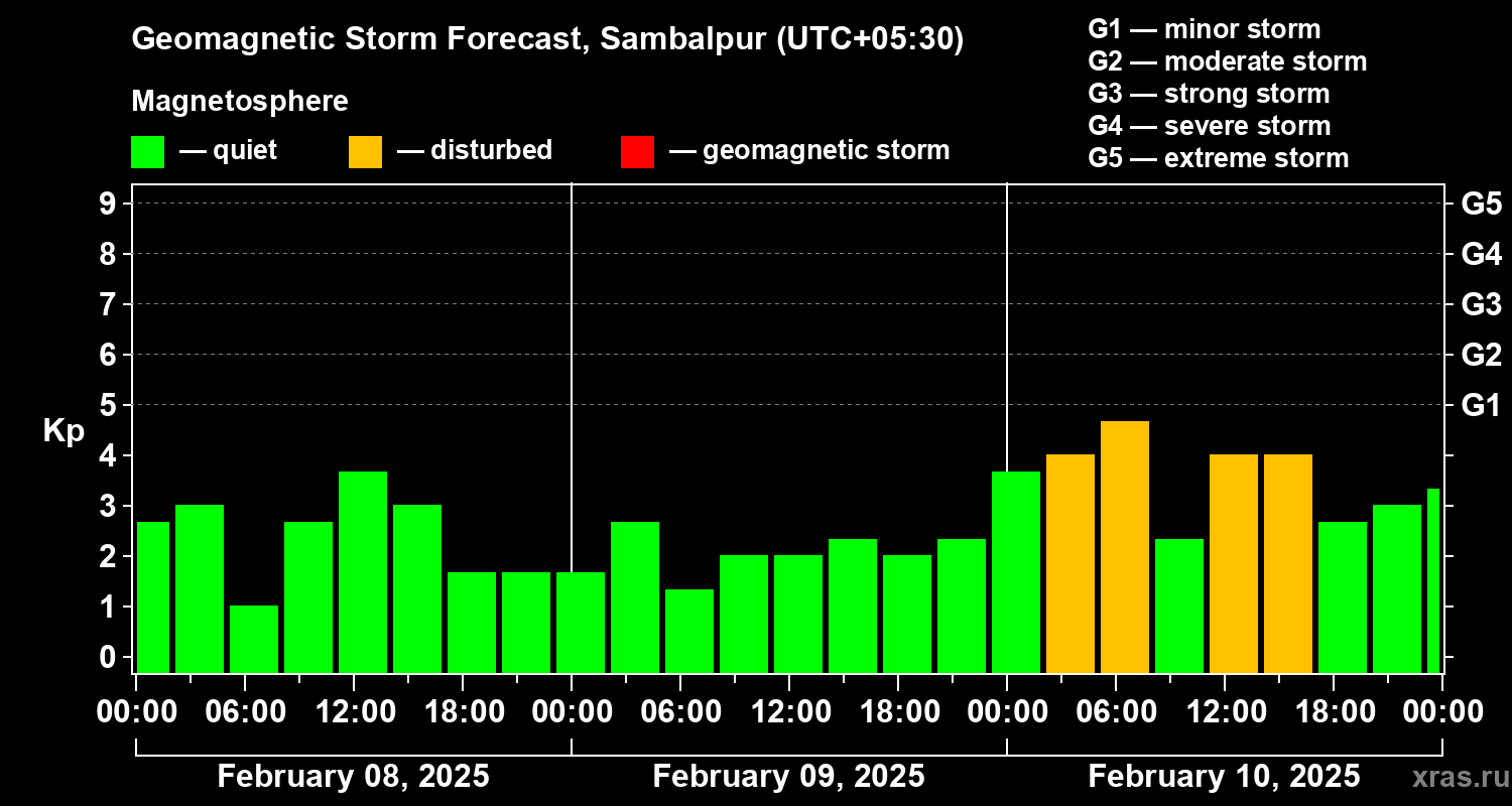 Geomagnetic storm forecast in Sambalpur for Feb 08, 2025