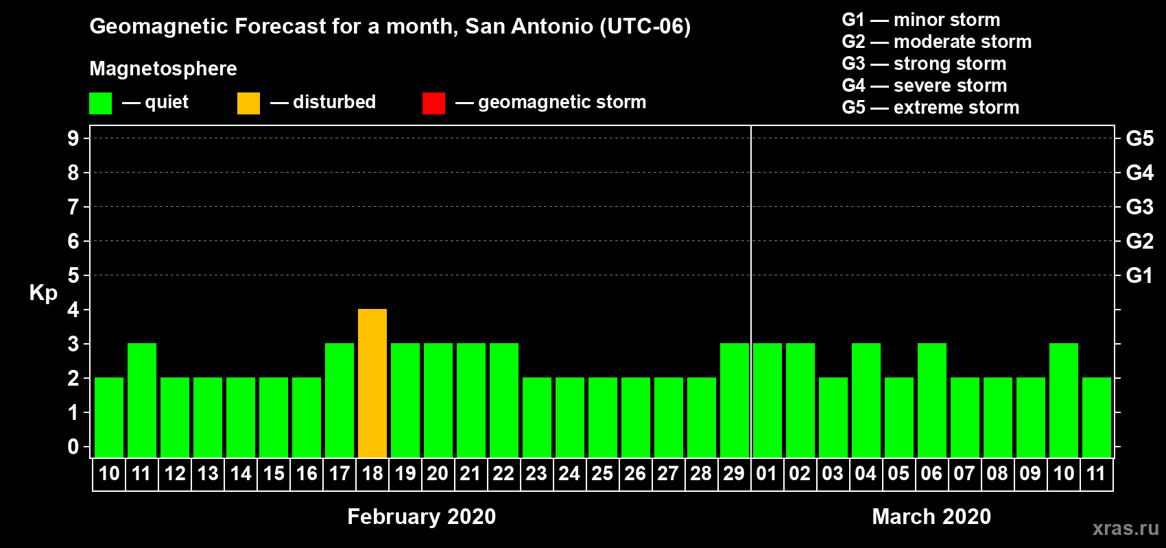 Geomagnetic storm forecast in San Antonio for Feb 10, 2020