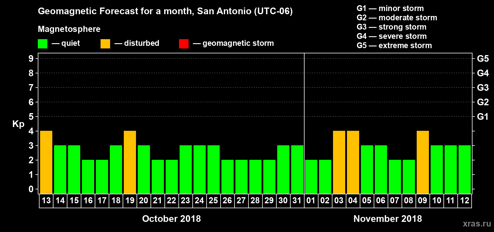Geomagnetic storm forecast in San Antonio for Oct 13, 2018