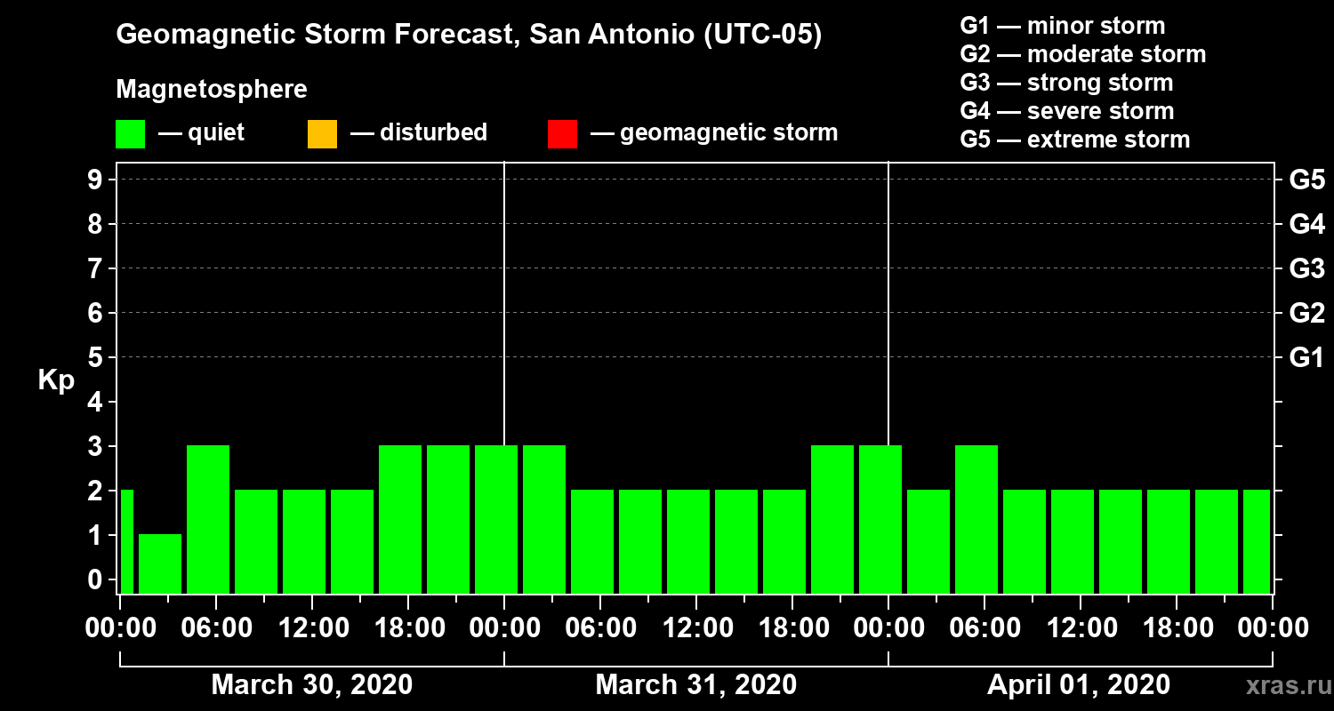 Geomagnetic activity forecast in San Antonio — Mar 30, 2020