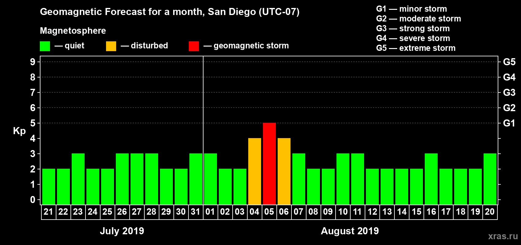 Geomagnetic storm forecast in San Diego for Jul 21, 2019