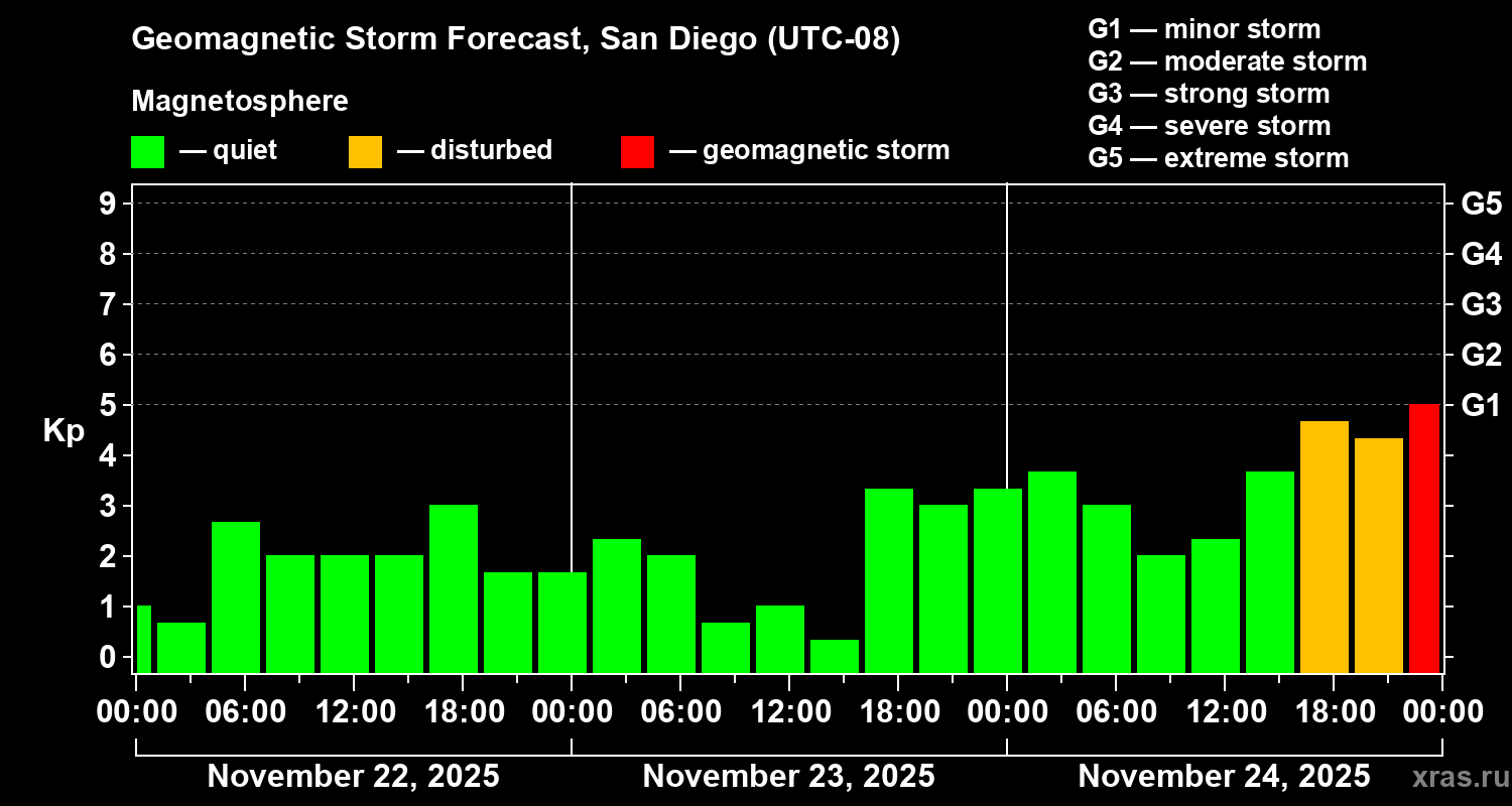 Geomagnetic storm forecast in San Diego for Nov 22, 2025
