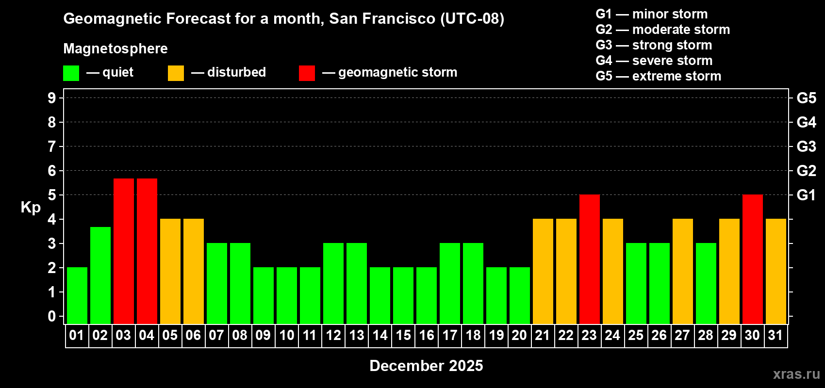Geomagnetic storm forecast in San Francisco for Dec 01, 2025