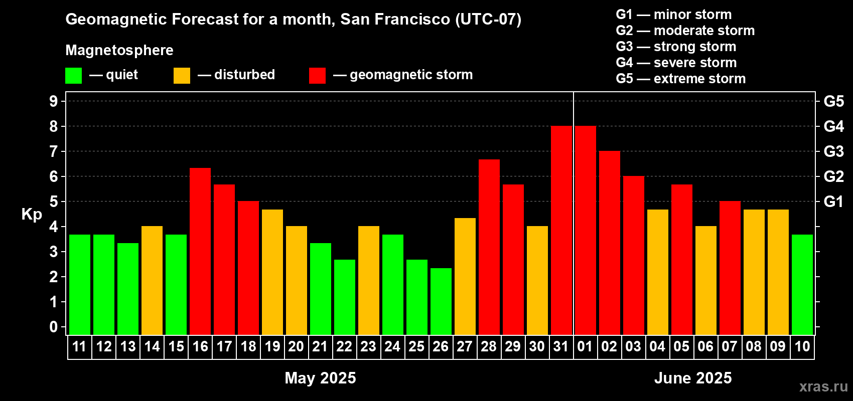 Geomagnetic storm forecast in San Francisco for May 11, 2025