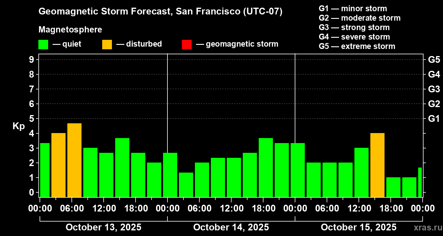 Geomagnetic storm forecast in San Francisco for Oct 13, 2025