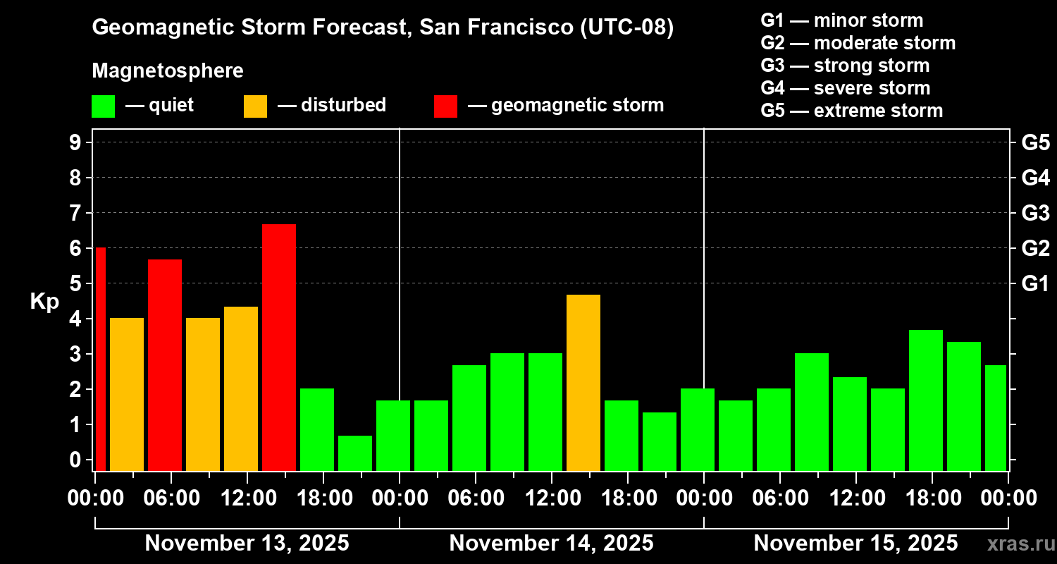 Geomagnetic storm forecast in San Francisco for Nov 13, 2025