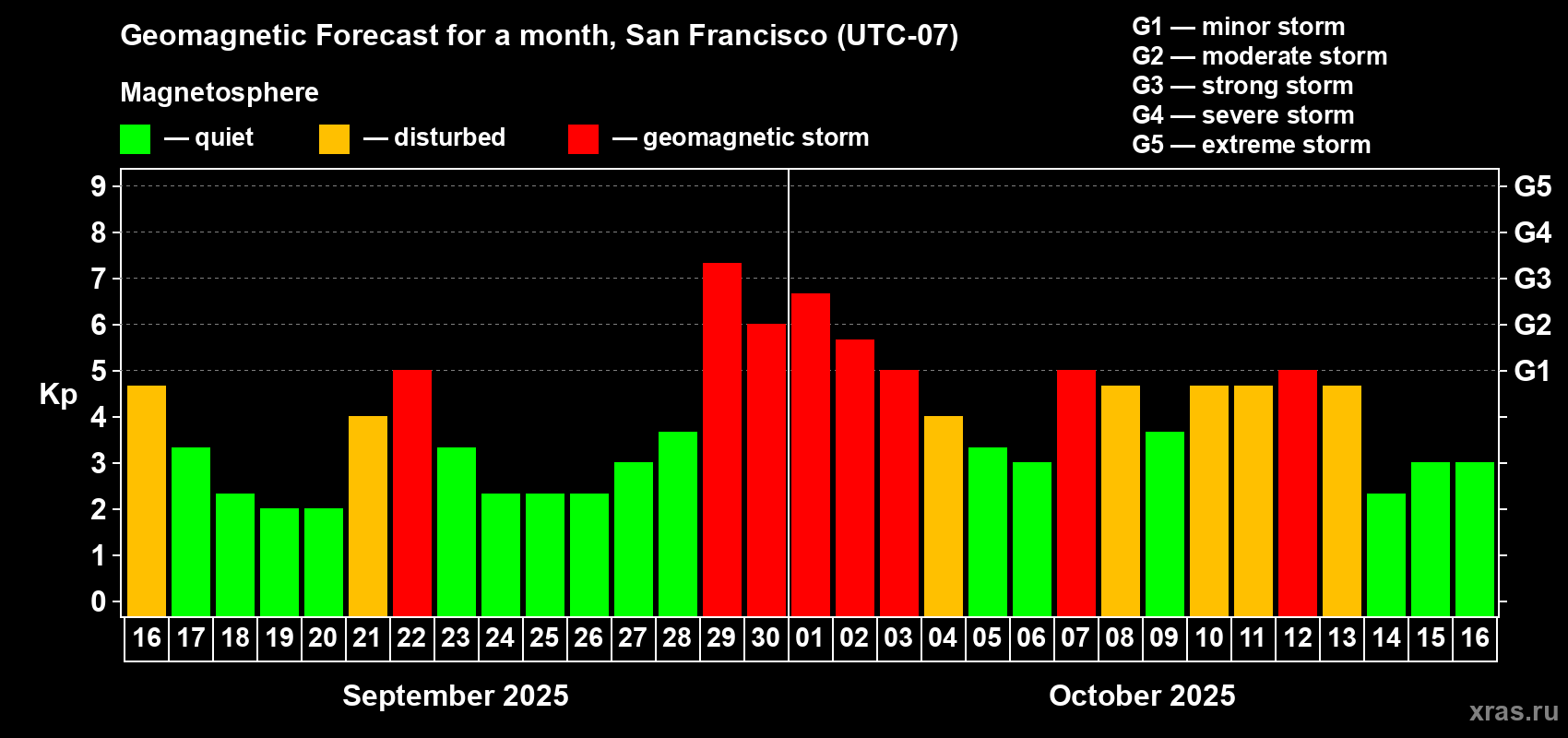 Geomagnetic storm forecast in San Francisco for Sep 16, 2025