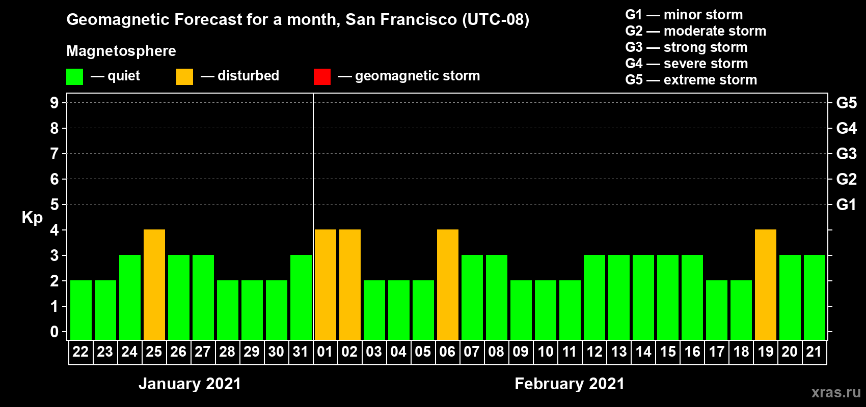 Geomagnetic storm forecast in San Francisco for Jan 22, 2021