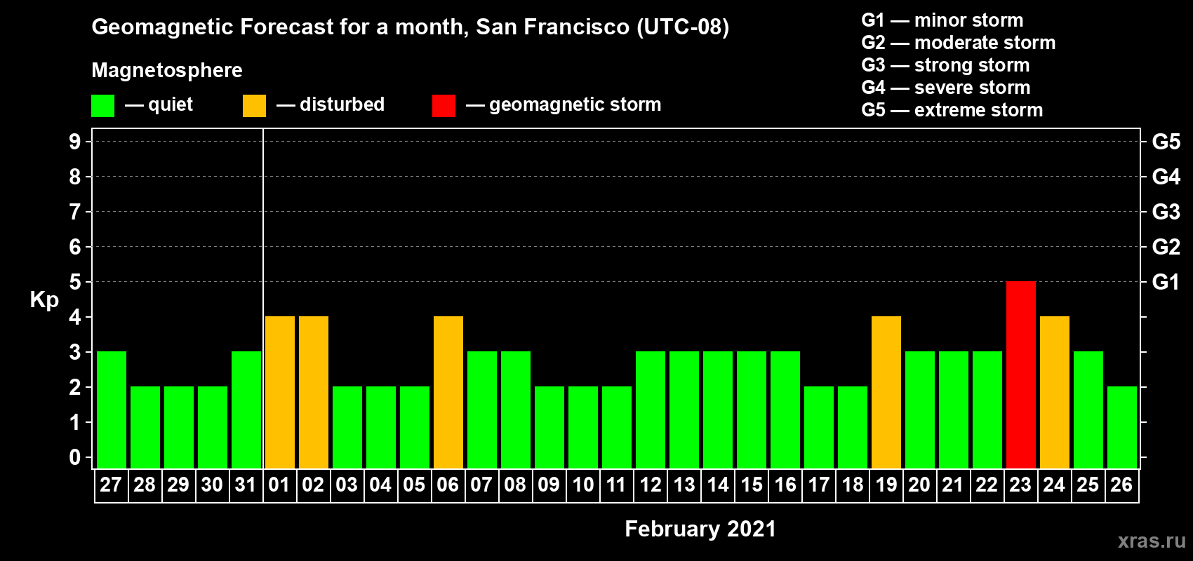 Geomagnetic storm forecast in San Francisco for Jan 27, 2021
