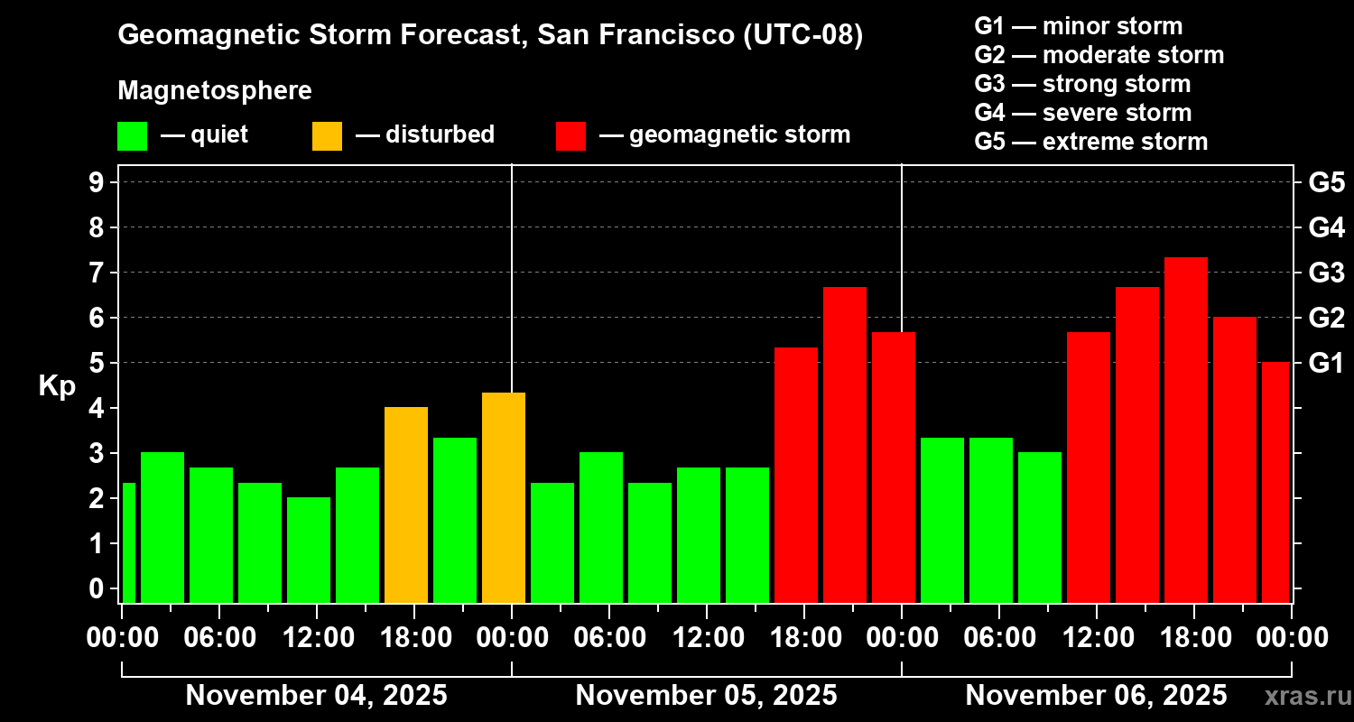 Geomagnetic storm forecast in San Francisco for Nov 04, 2025
