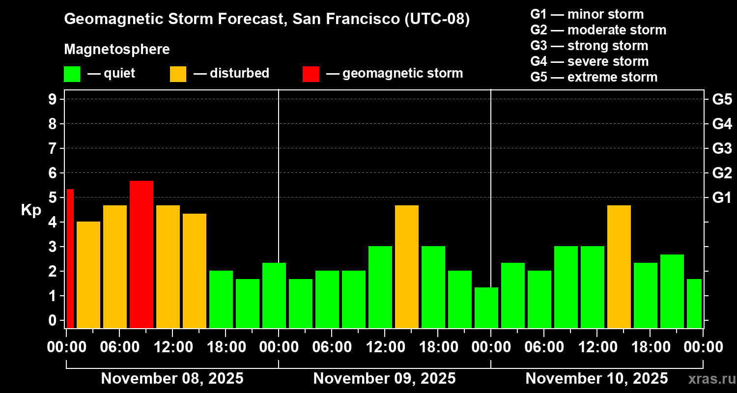 Geomagnetic storm forecast in San Francisco for Nov 08, 2025