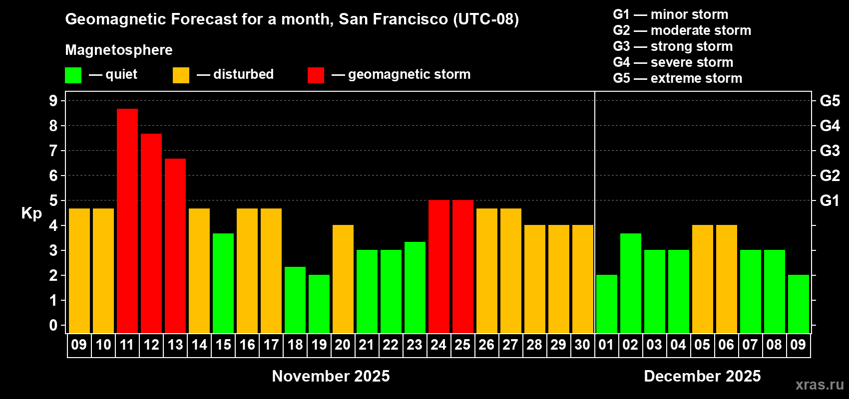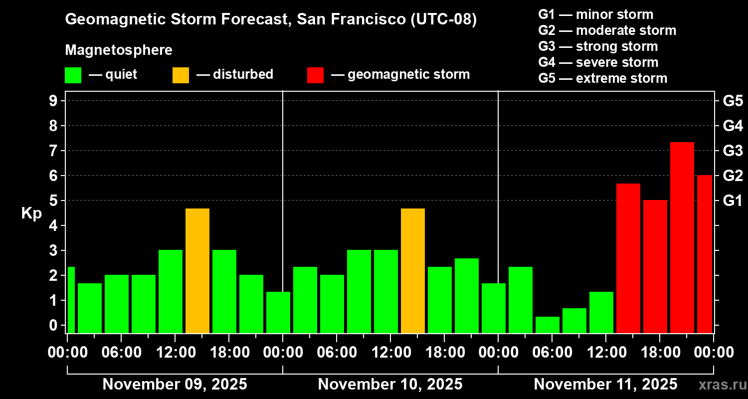 Geomagnetic storm forecast in San Francisco for Nov 09, 2025