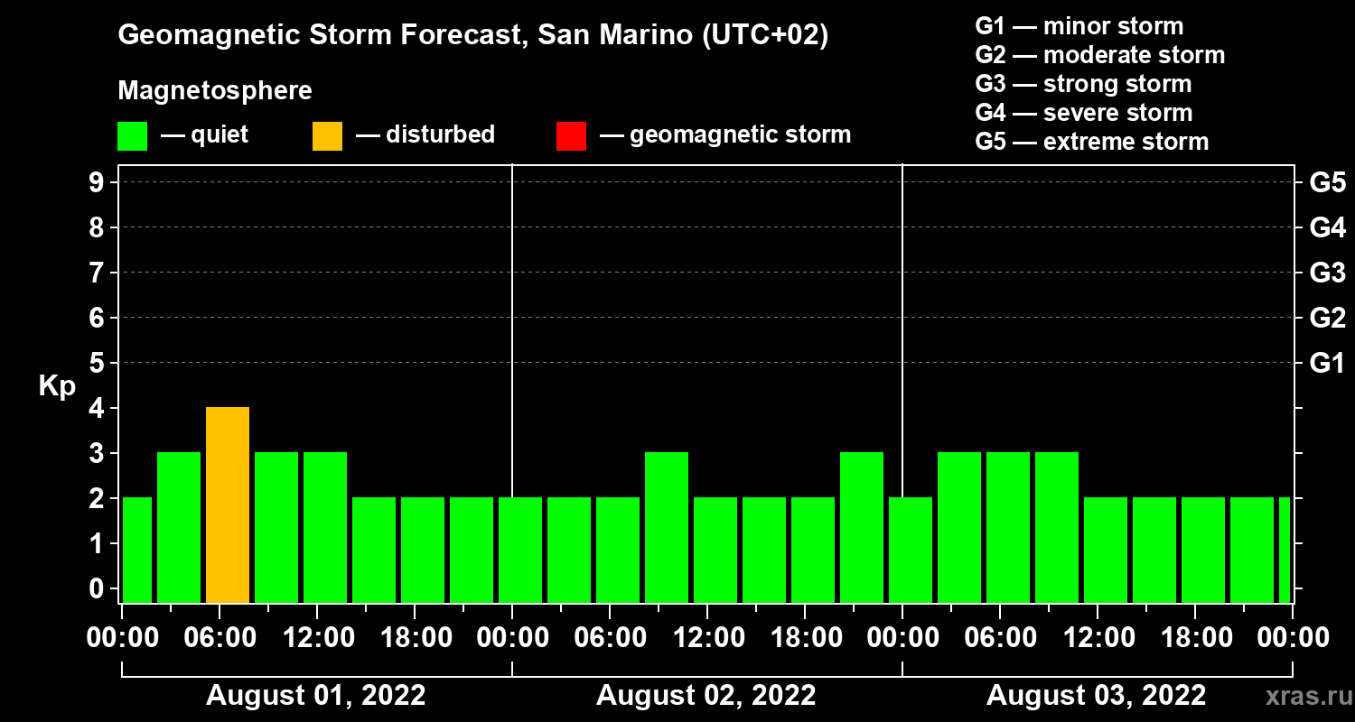 Geomagnetic storm forecast in San Marino for Aug 01, 2022