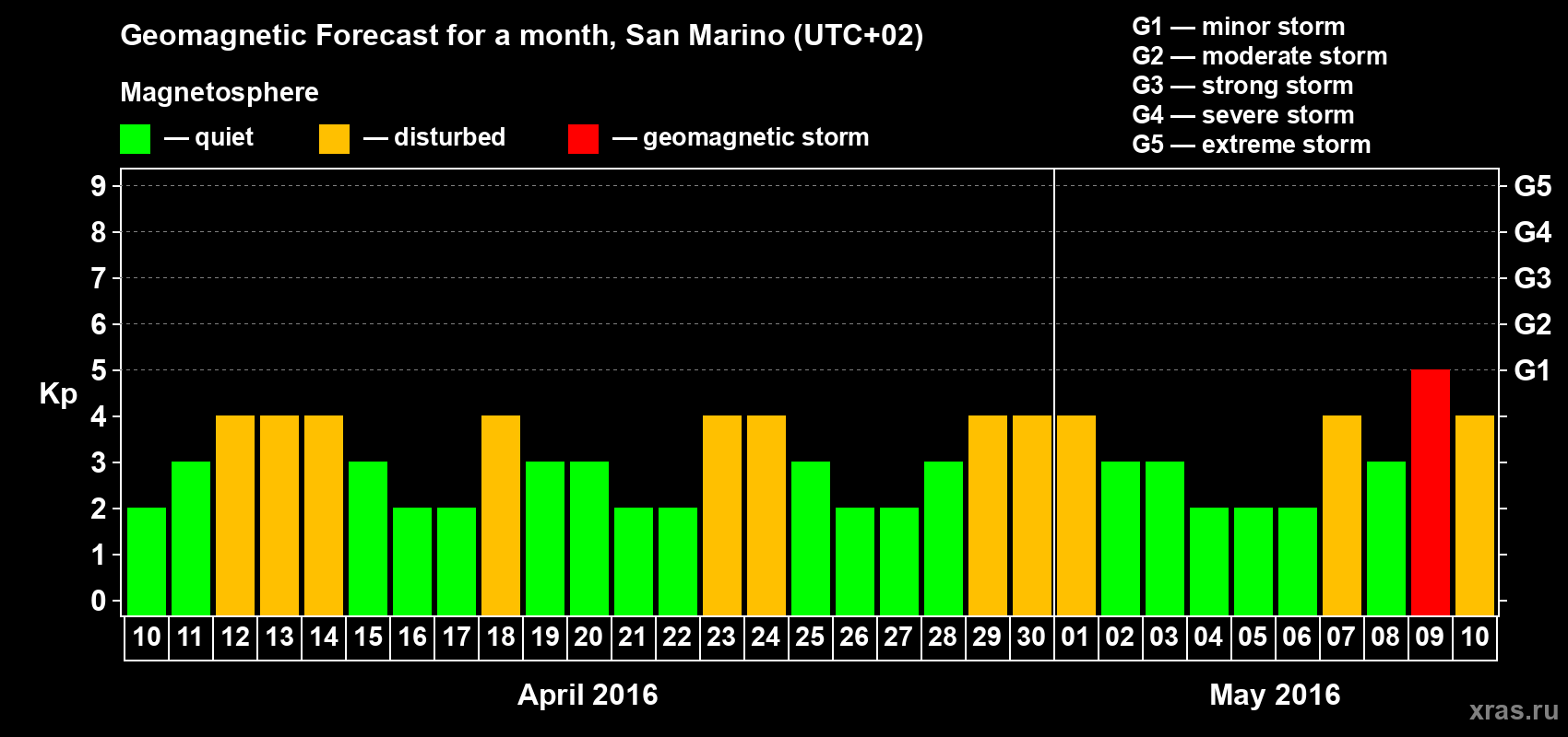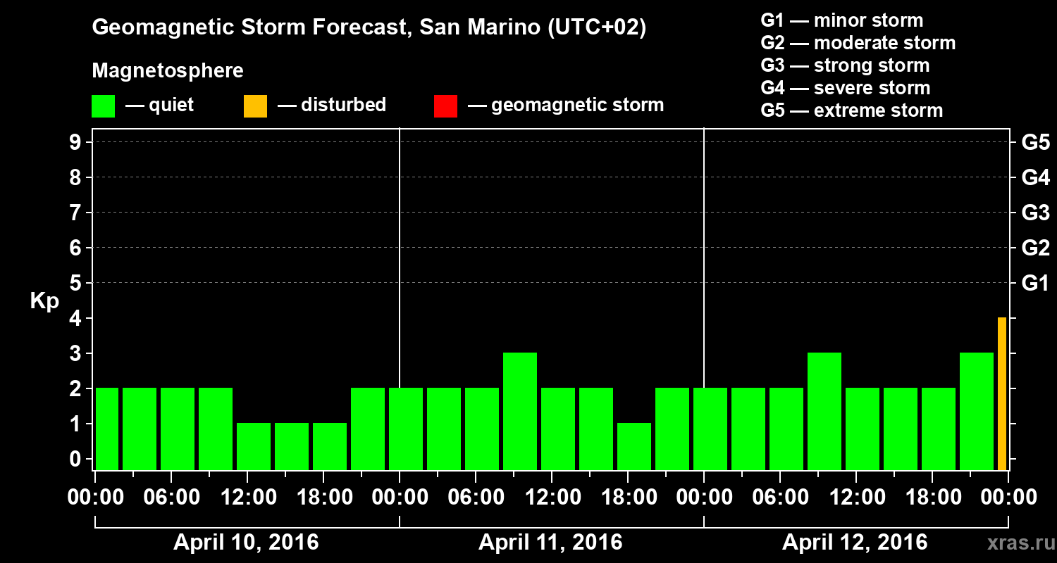 Geomagnetic storm forecast in San Marino for Apr 10, 2016