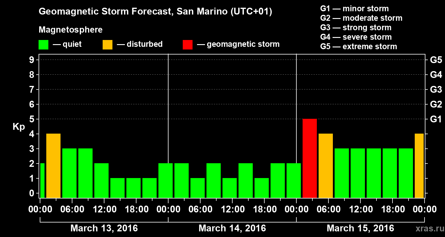 Geomagnetic storm forecast in San Marino for Mar 13, 2016