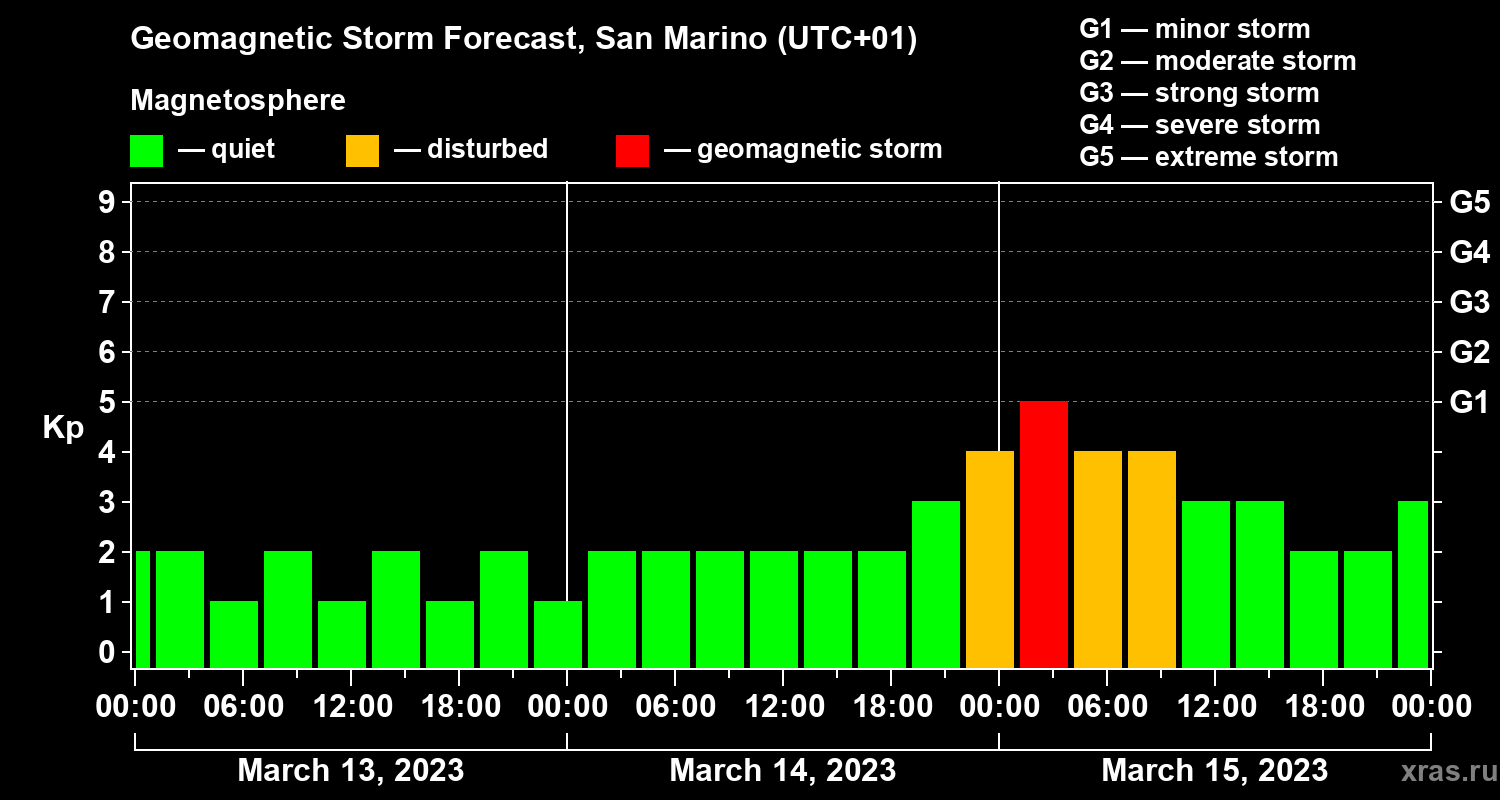 Geomagnetic storm forecast in San Marino for Mar 13, 2023
