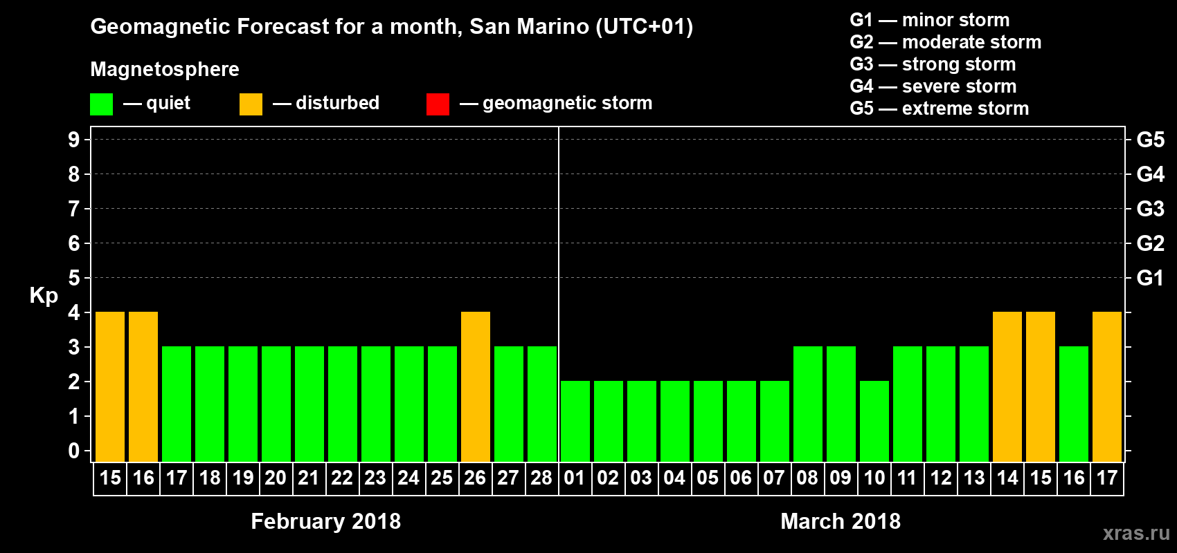 Geomagnetic storm forecast in San Marino for Feb 15, 2018
