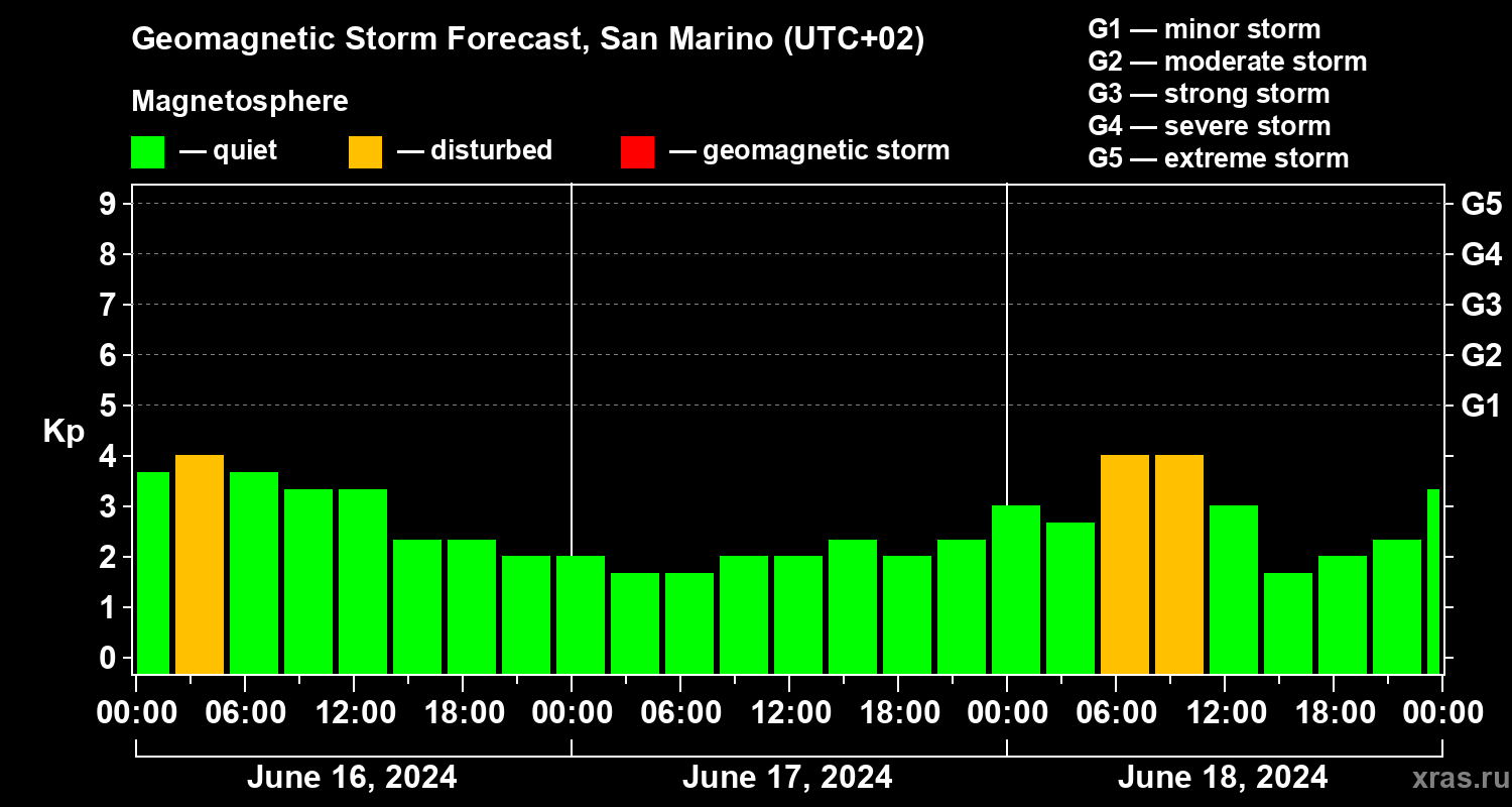 Geomagnetic storm forecast in San Marino for Jun 16, 2024