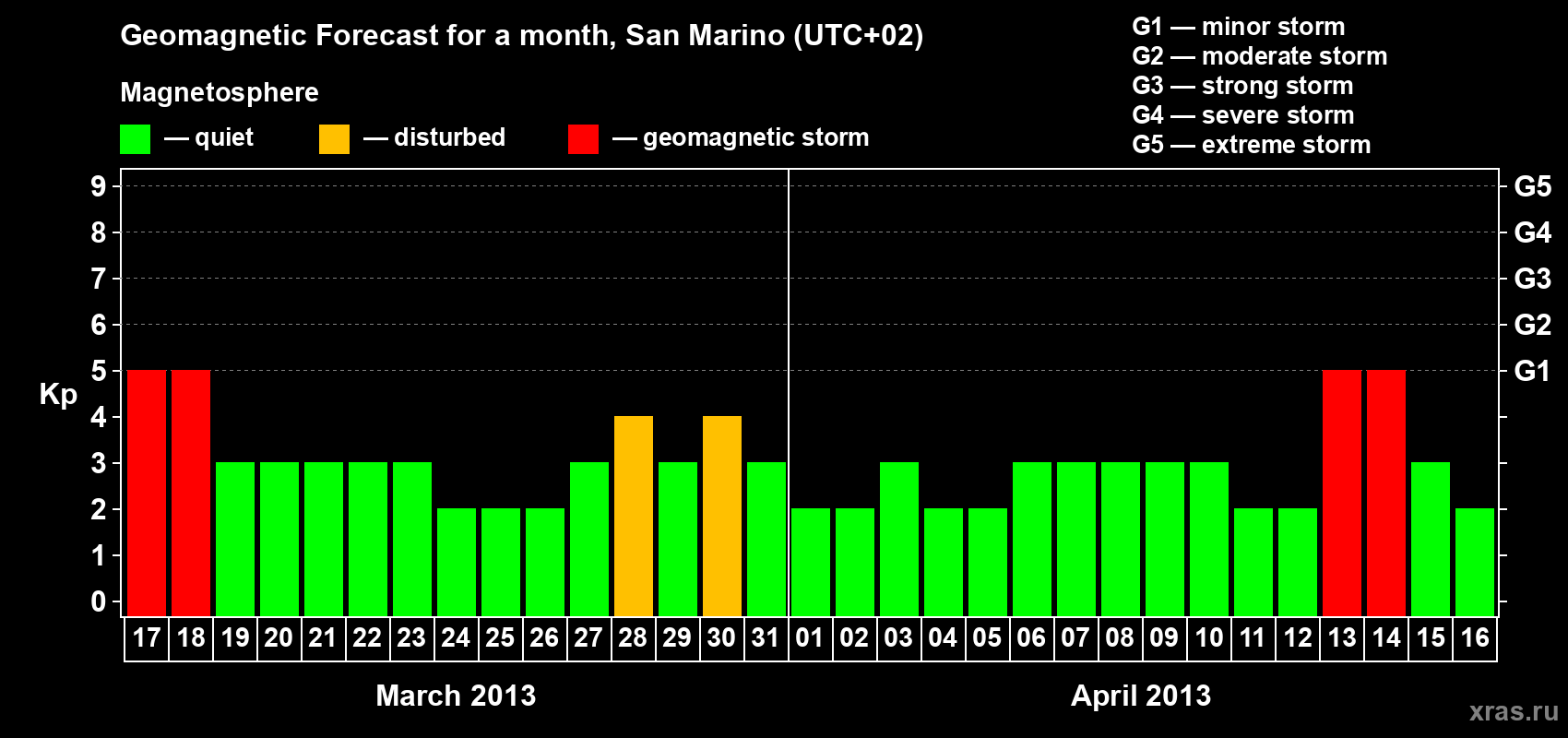 Geomagnetic storm forecast in San Marino for Mar 17, 2013