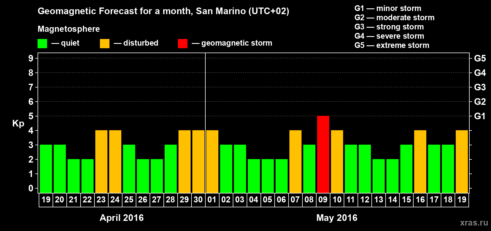 Geomagnetic storm forecast in San Marino for Apr 19, 2016