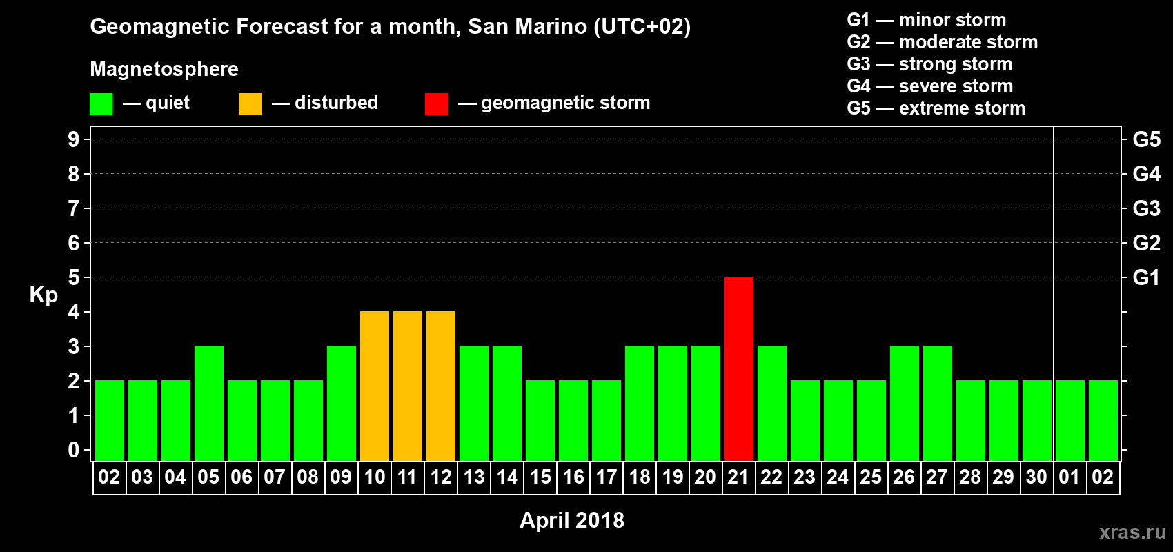 Geomagnetic storm forecast in San Marino for Apr 02, 2018