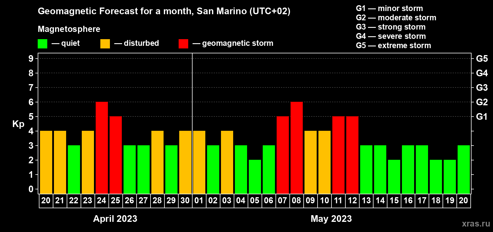 Geomagnetic storm forecast in San Marino for Apr 20, 2023