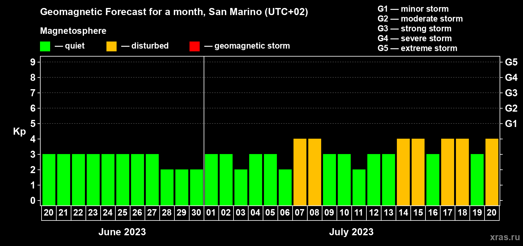 Geomagnetic storm forecast in San Marino for Jun 20, 2023
