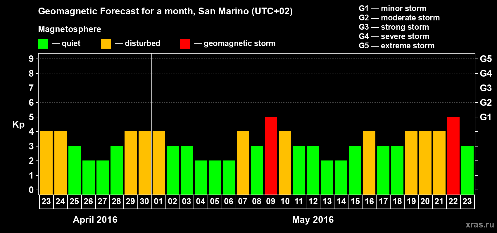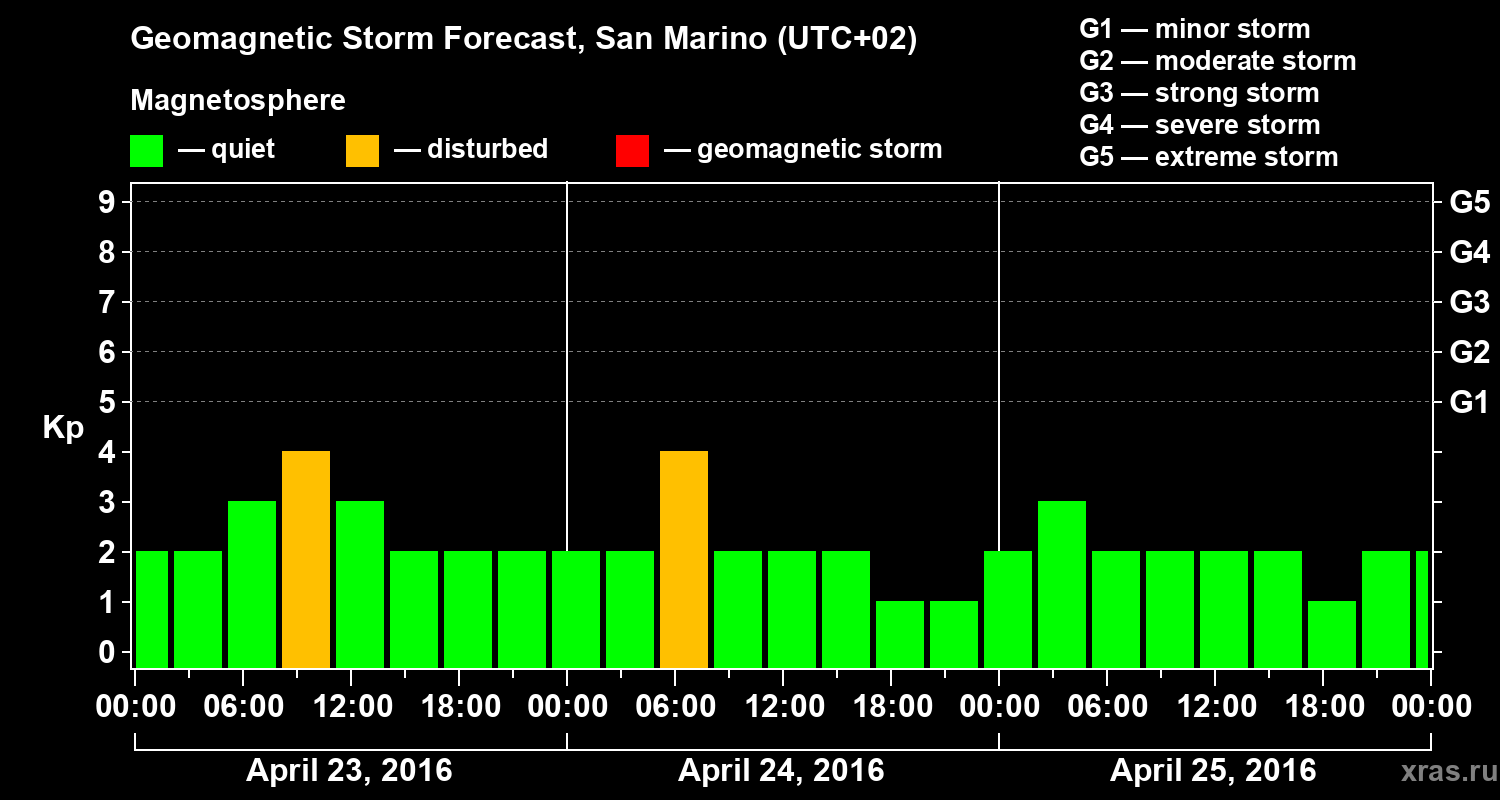 Geomagnetic storm forecast in San Marino for Apr 23, 2016