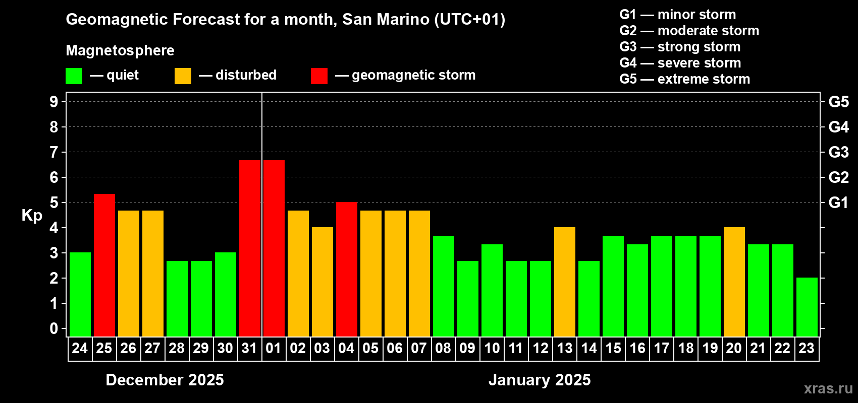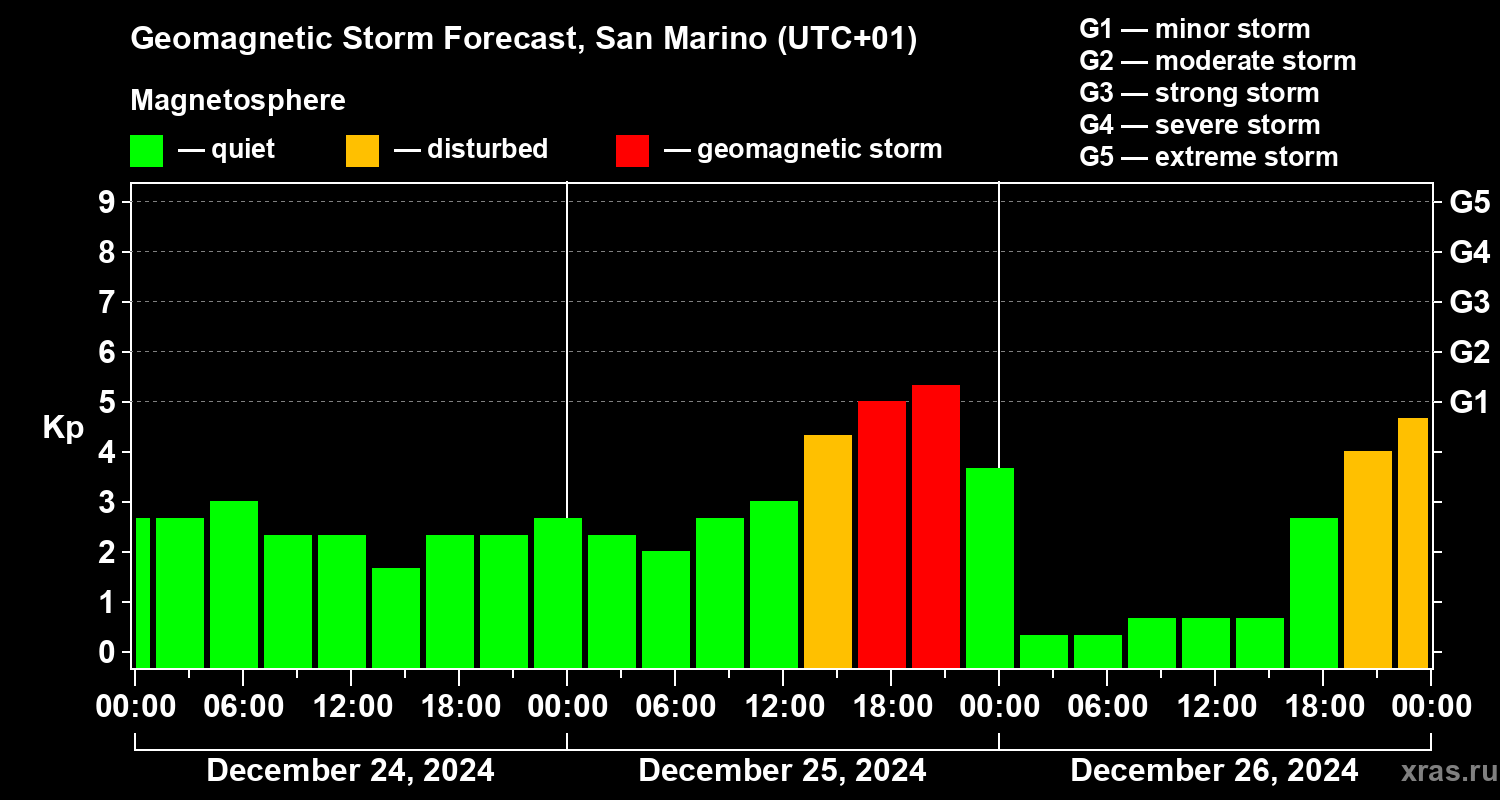 Geomagnetic storm forecast in San Marino for Dec 24, 2024
