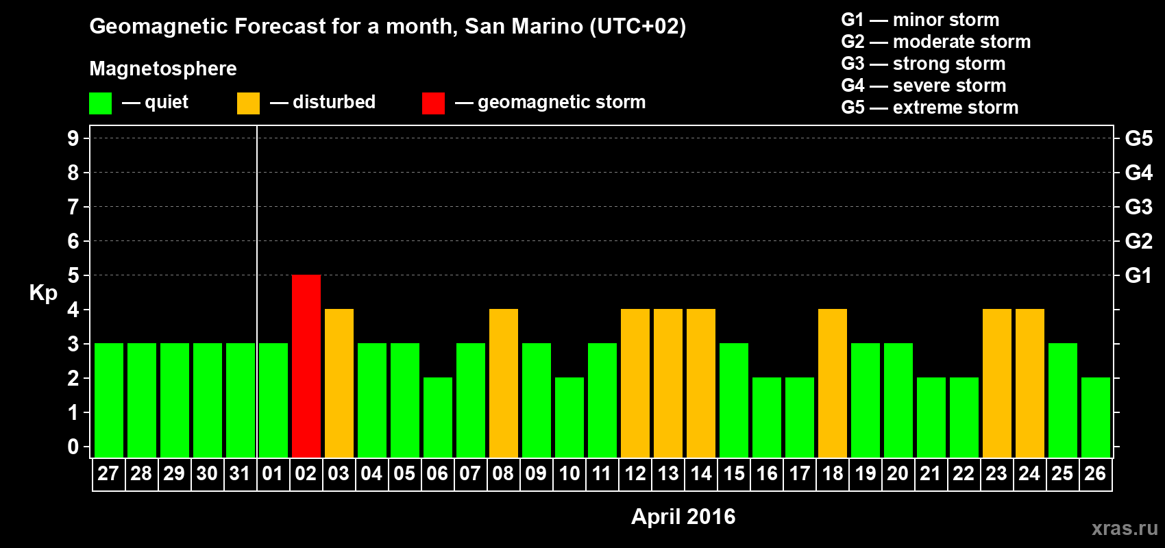 Geomagnetic storm forecast in San Marino for Mar 27, 2016