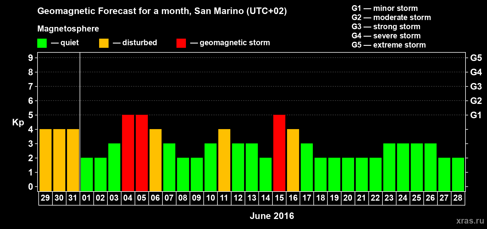 Geomagnetic storm forecast in San Marino for May 29, 2016