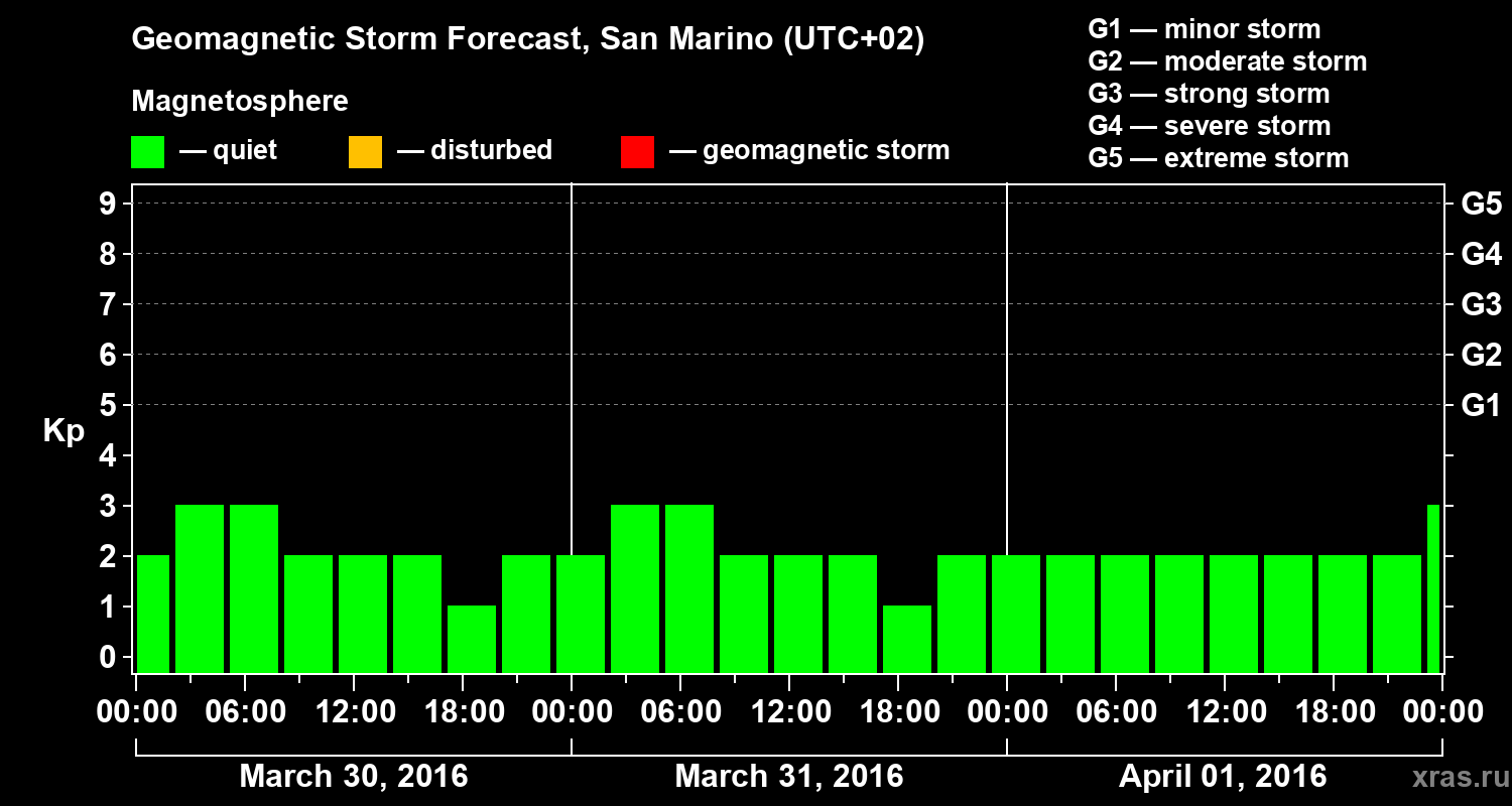 Geomagnetic storm forecast in San Marino for Mar 30, 2016