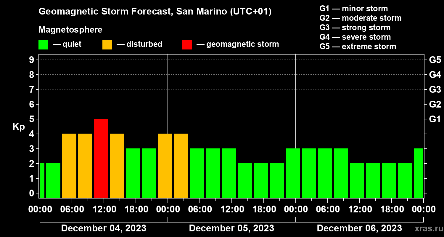 Geomagnetic storm forecast in San Marino for Dec 04, 2023