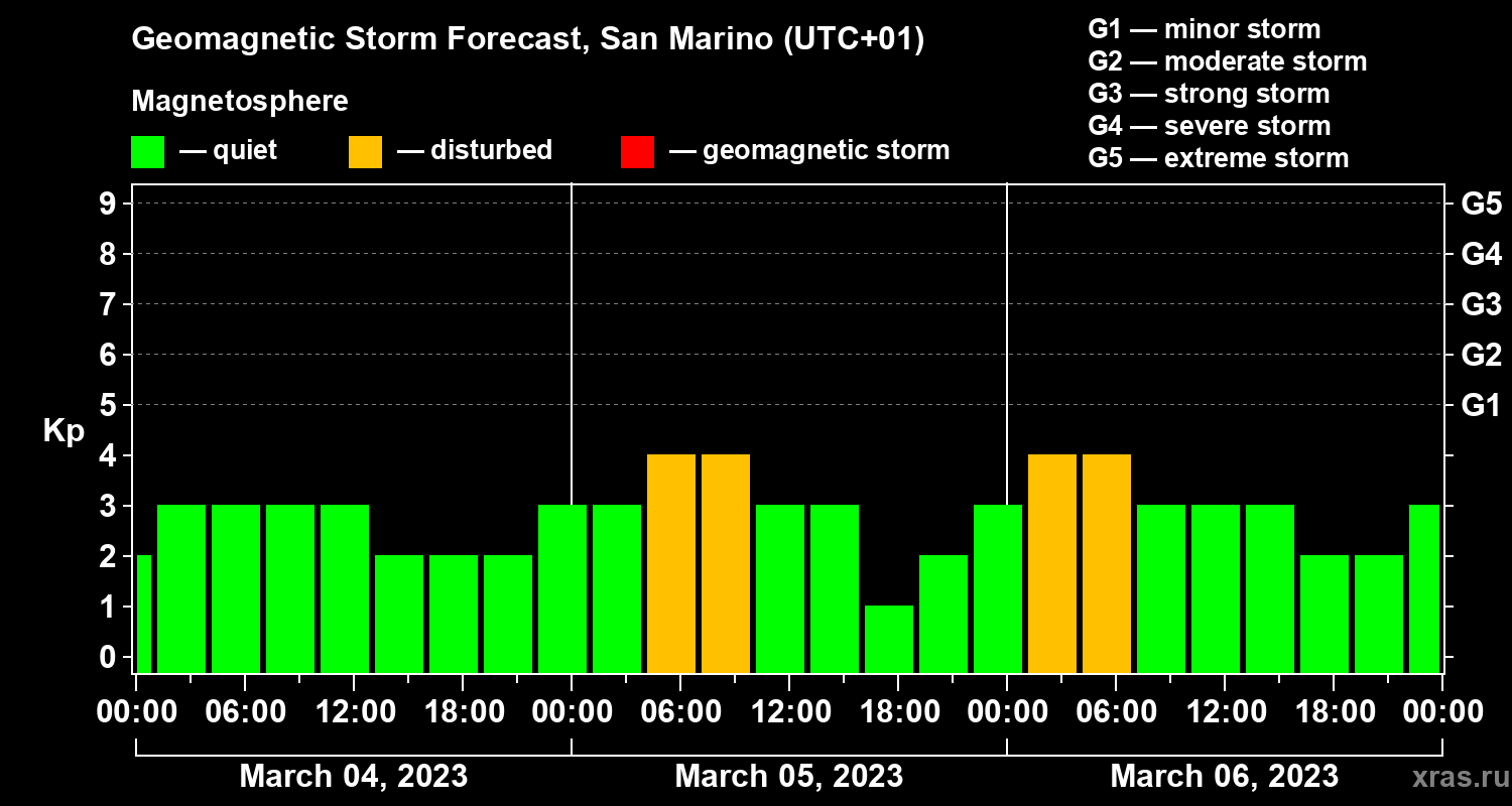 Geomagnetic storm forecast in San Marino for Mar 04, 2023