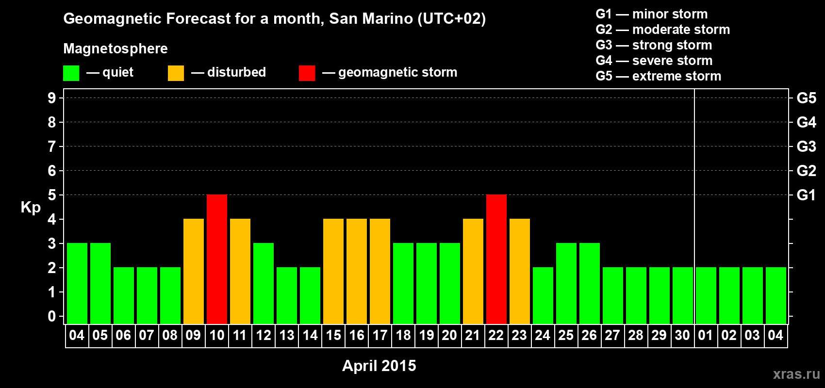 Geomagnetic storm forecast in San Marino for Apr 04, 2015