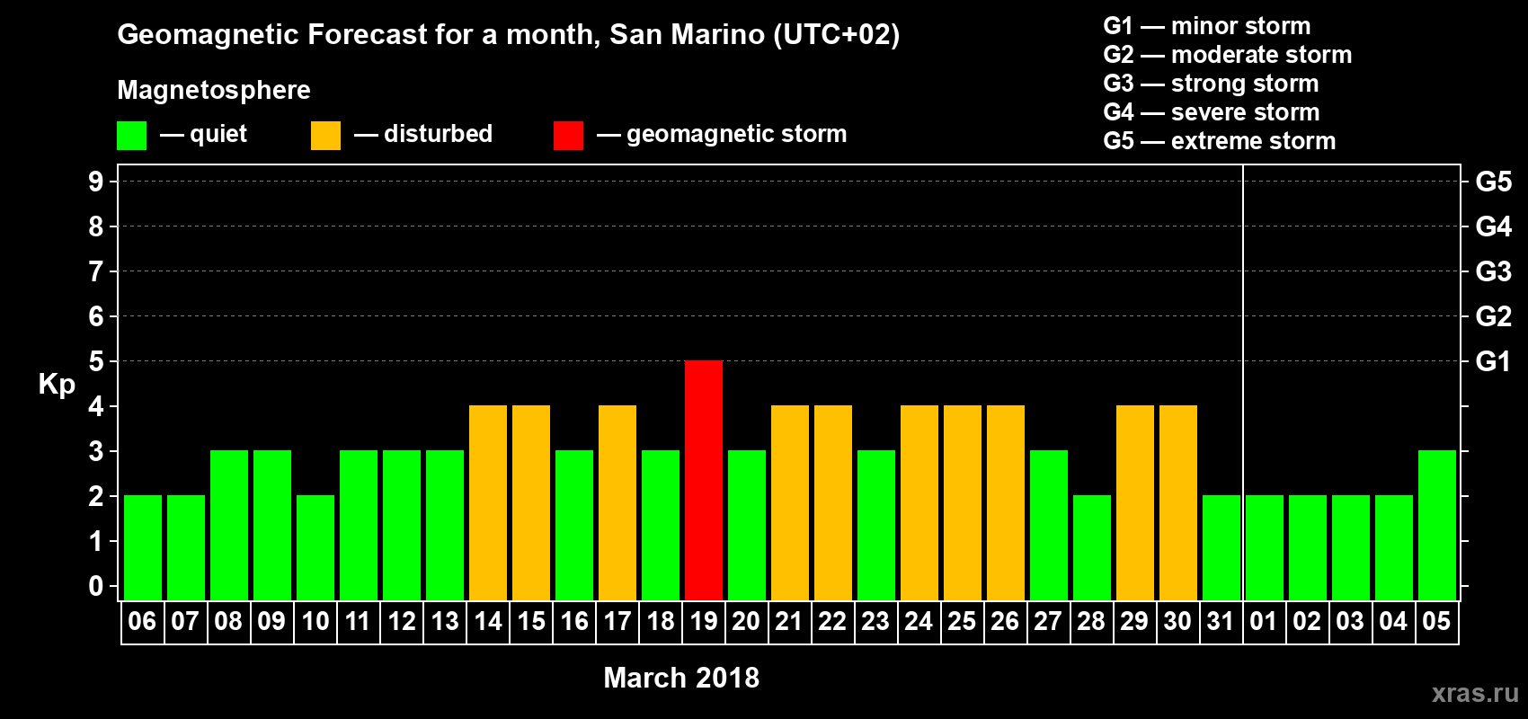 Geomagnetic storm forecast in San Marino for Mar 06, 2018
