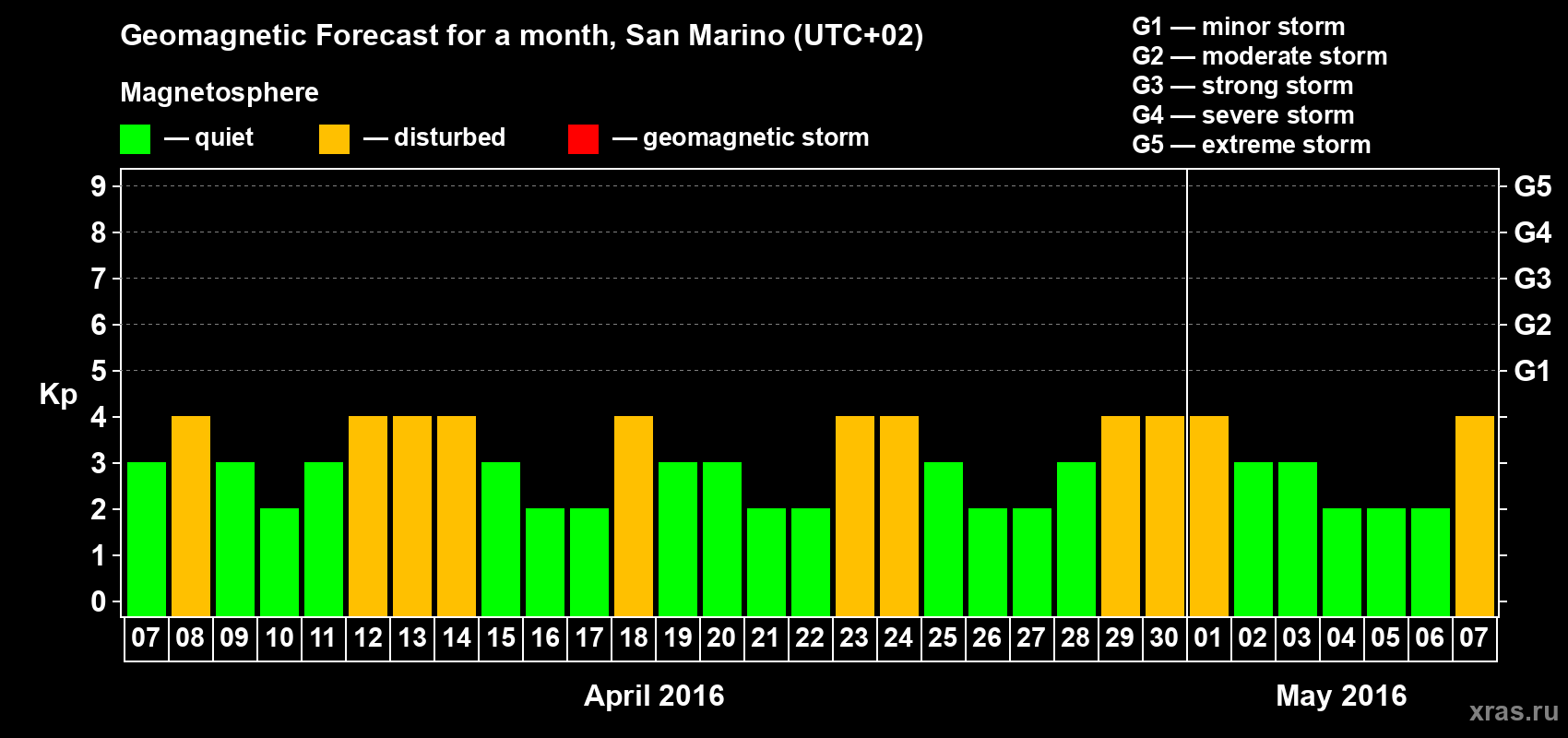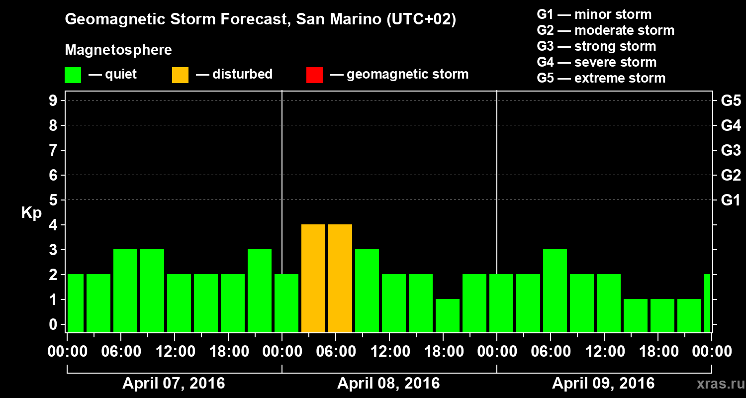 Geomagnetic storm forecast in San Marino for Apr 07, 2016