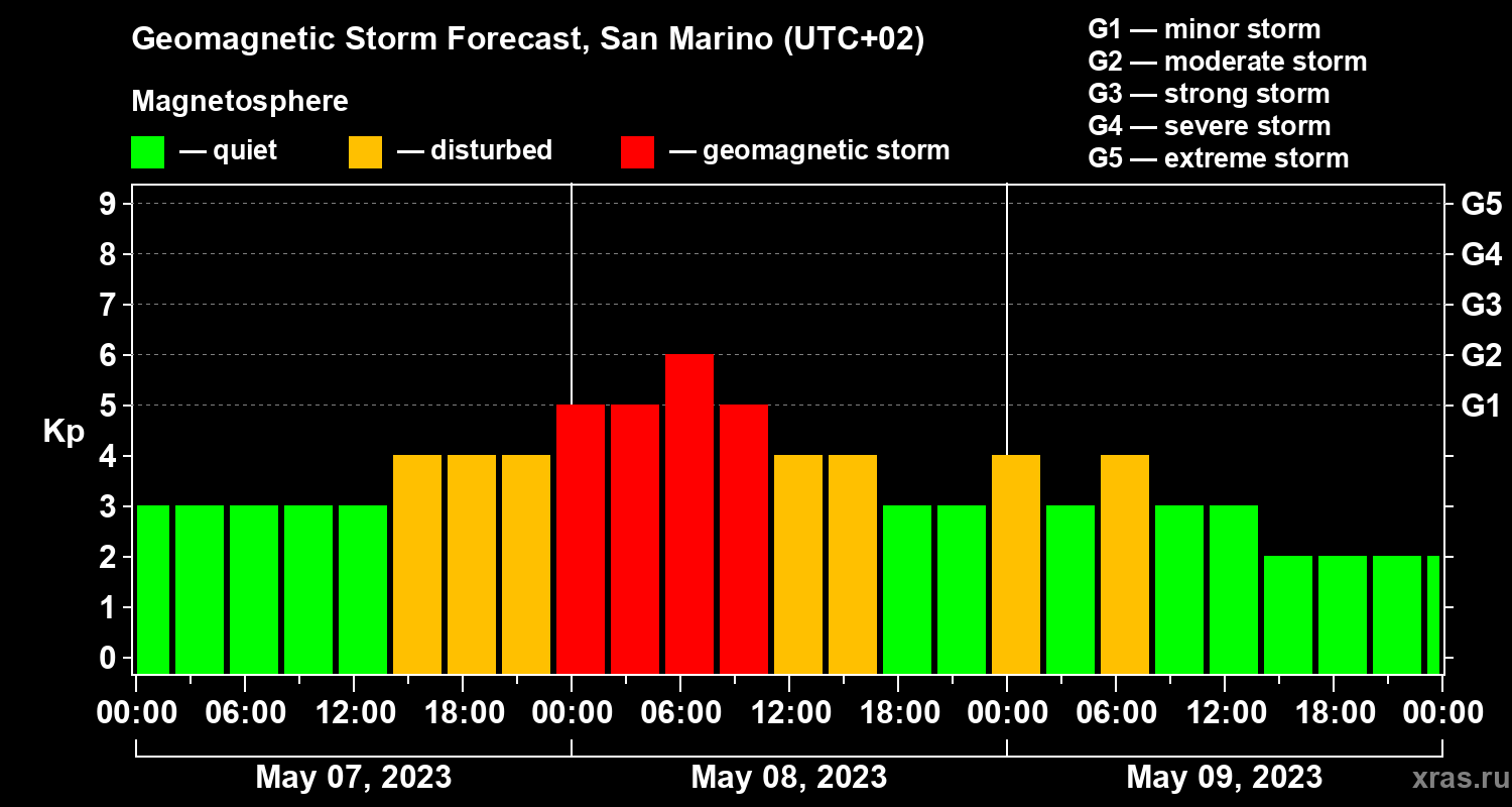 Geomagnetic storm forecast in San Marino for May 07, 2023