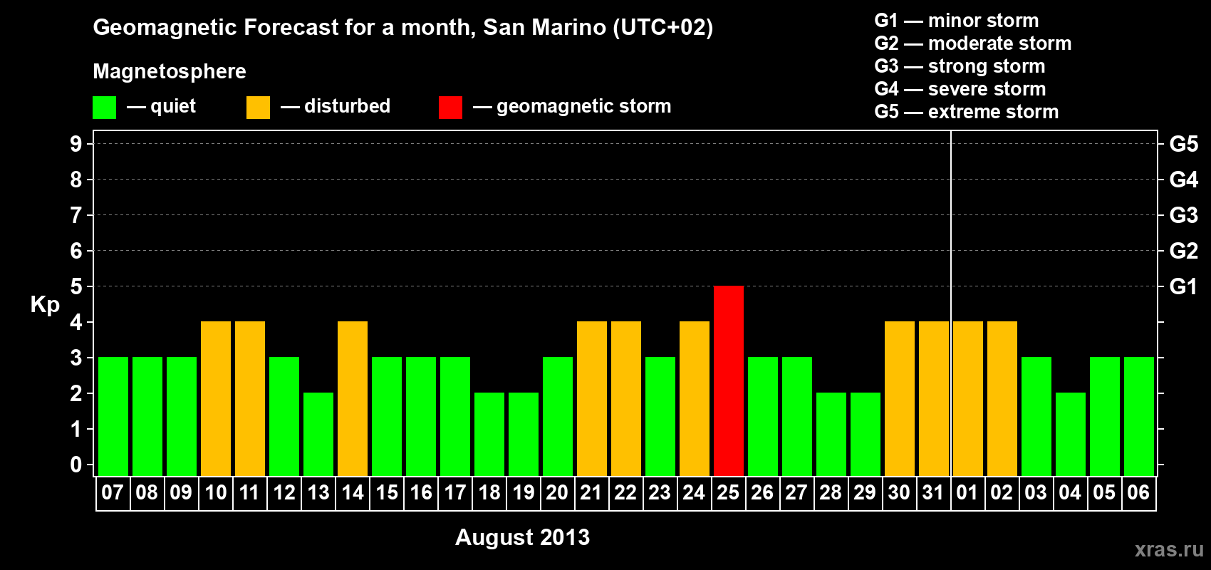 Geomagnetic storm forecast in San Marino for Aug 07, 2013