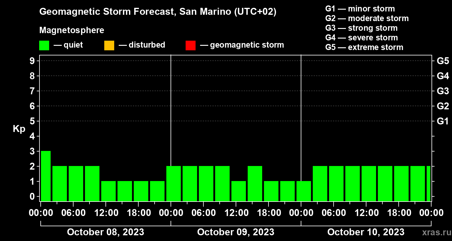 Geomagnetic storm forecast in San Marino for Oct 08, 2023