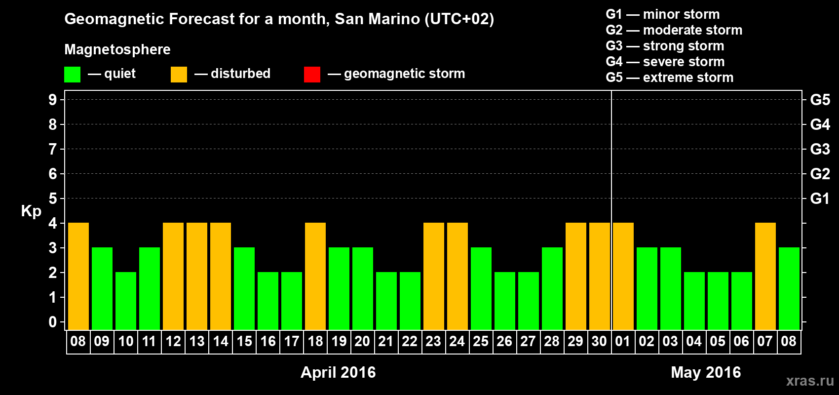 Geomagnetic storm forecast in San Marino for Apr 08, 2016